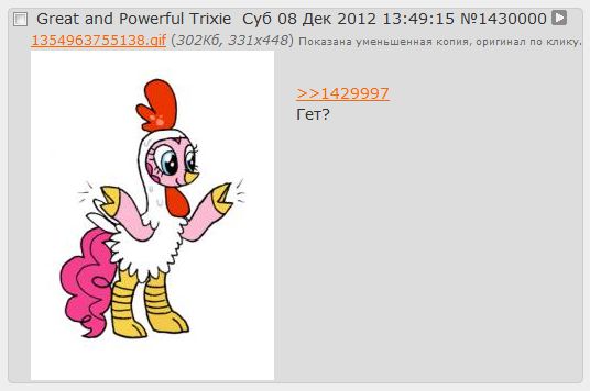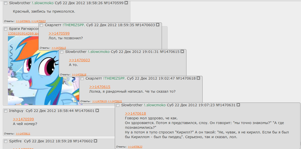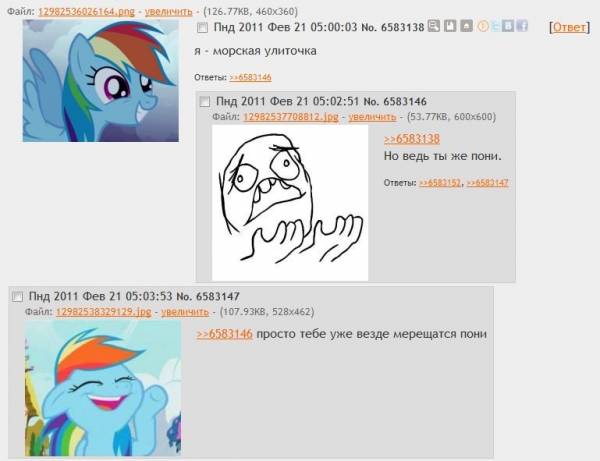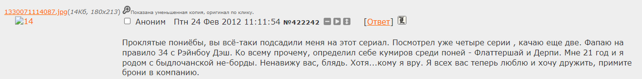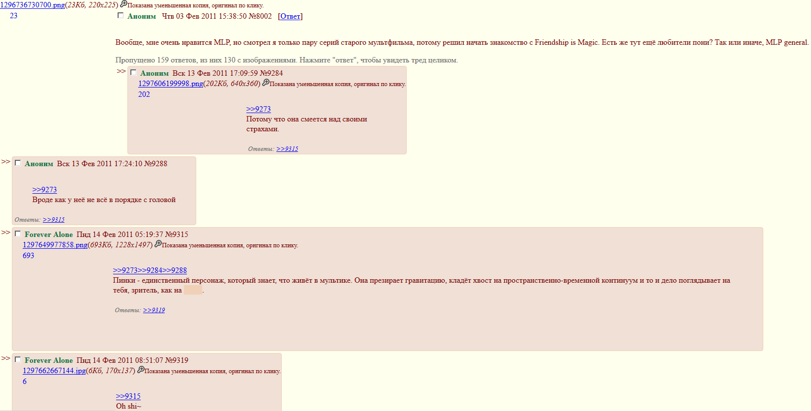 >>4329154 >Холод Из него я вообще узнал, что есть какие-то говорящие цветные лошади, и что они популярны. И я уже не вспомню, что искал зимней ночью 2012 года в гуголе, когда наткнулся на Холод. Решил глянуть - и всё, заверьте.