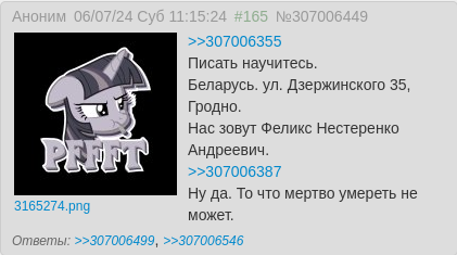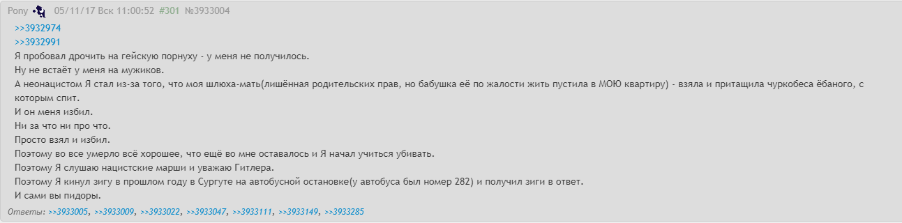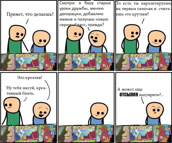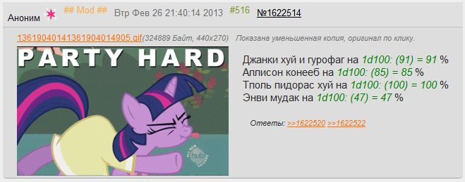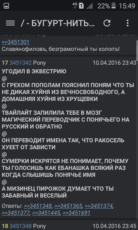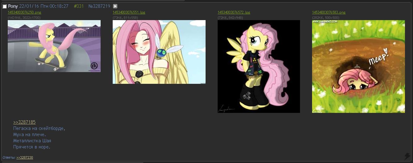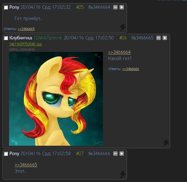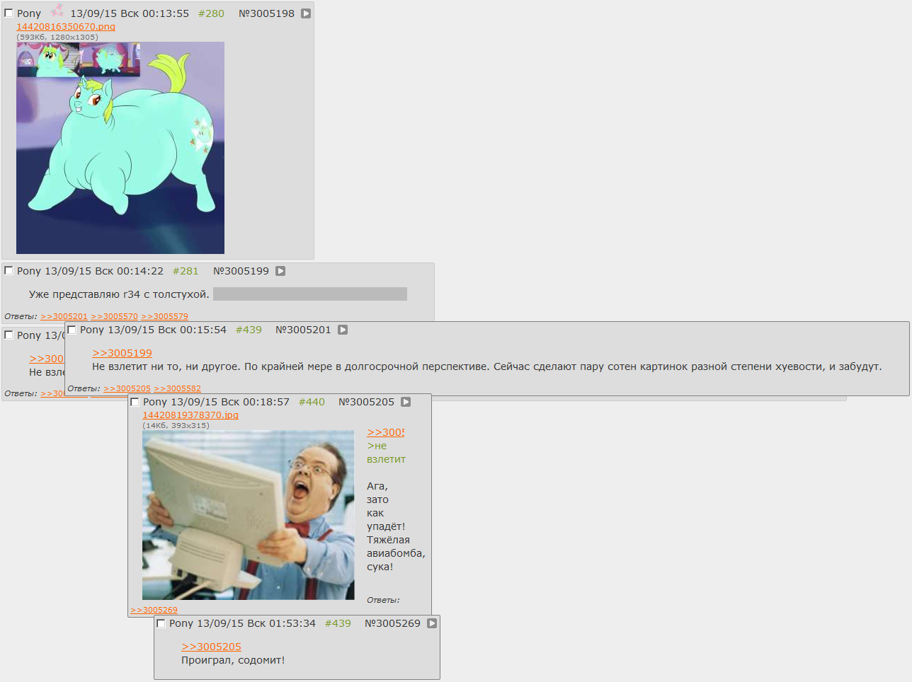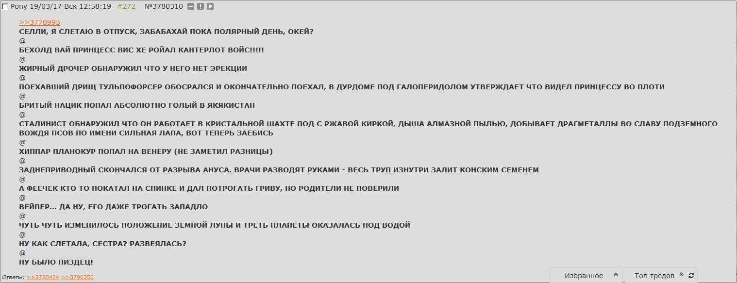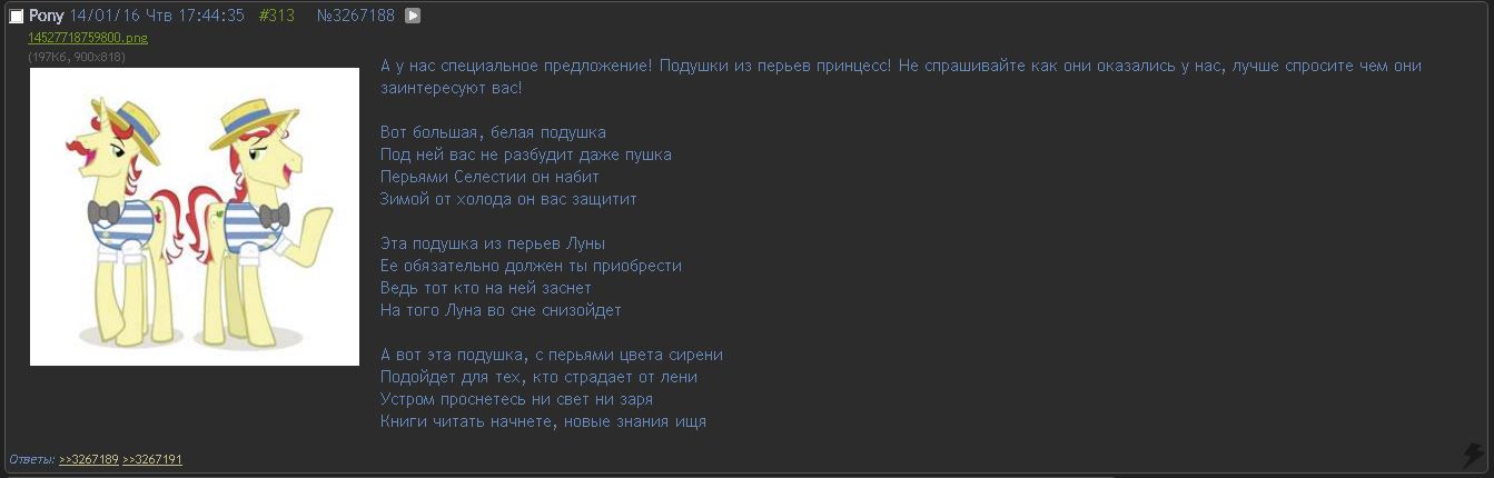 Туда, где водятся Майнкрафтеры и фурри, quadrobers и прочая шиза, - Летают раз в неделю самолёты, Потом плывут неделю пароходы, Потом идут неделю вездеходы, А пони тред в психушку довезет тебя за полчаса. А пони тред до дурки доведет тебя за полчаса…