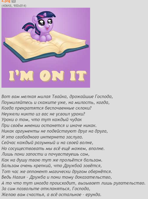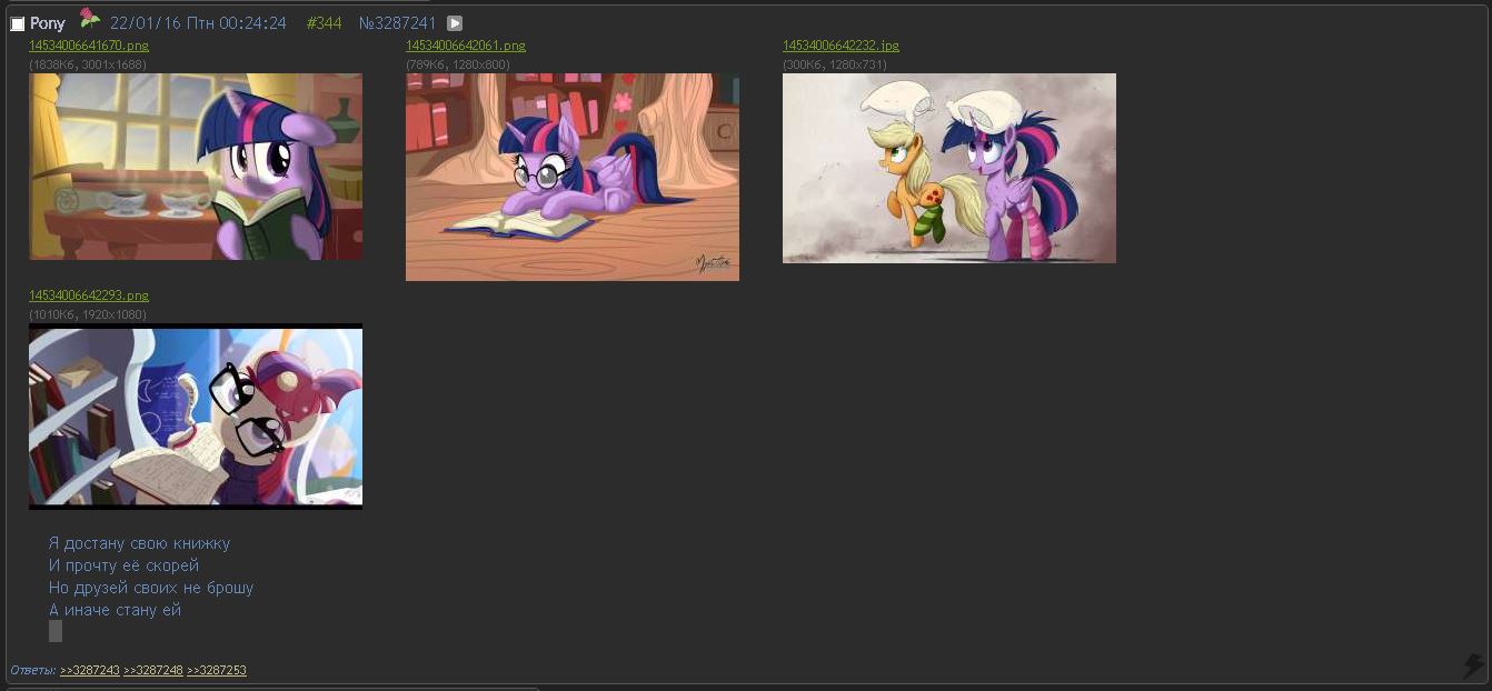 Заходите, не стесняйтесь, Каждый стул берёт себе. У компов располагайтесь, Открывайте /mlp. Раз уж в генерал попались, Вам помочь чуть-чуть хочу: Проводить постов анализ Я вас, дети, научу.