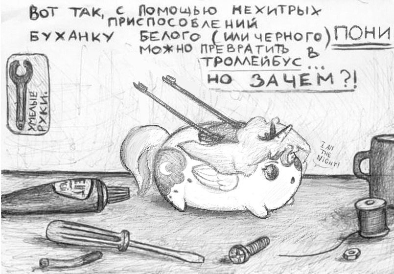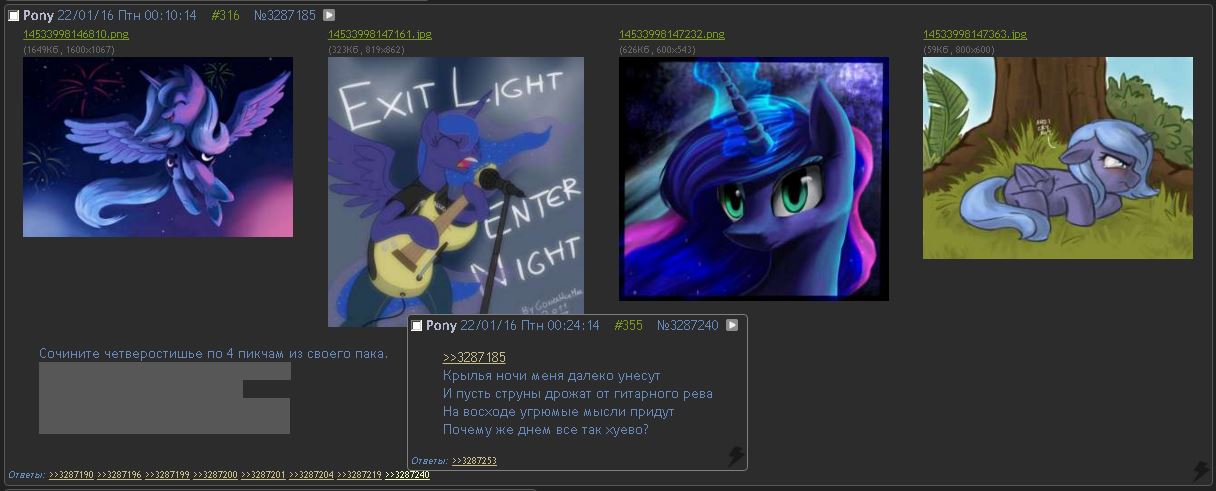 У пони длинная чёлка Из нежного шёлка, Она возит анонов В такие края, Где скуфы капчуют Грифоны поносят, И совы визжат! И совы Сипухи визжат!