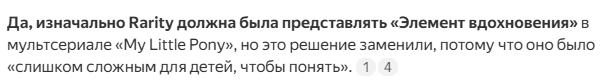 >>4414878 Не обращай внимания на этих. Они нюфаги и не в курсе, что Рарита - не элемент Щедрости, а элемент Вдохновения. Вдохновения, в каком бы виде оно не проявлялось.