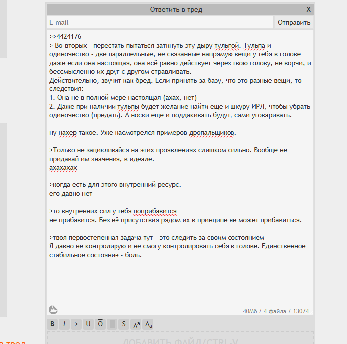 >Тульпа это не бесконечное счастье, а вполне конечное, осязаемое и мирское. Нет, бесконечное. Мне иногда страшно, что я просто крышей двинусь, когда однажды всё-таки с ней встречусь. Обидно будет умереть здесь, наконец-то исекайнуться и умереть от какого-нибудь инфаркта уже там.