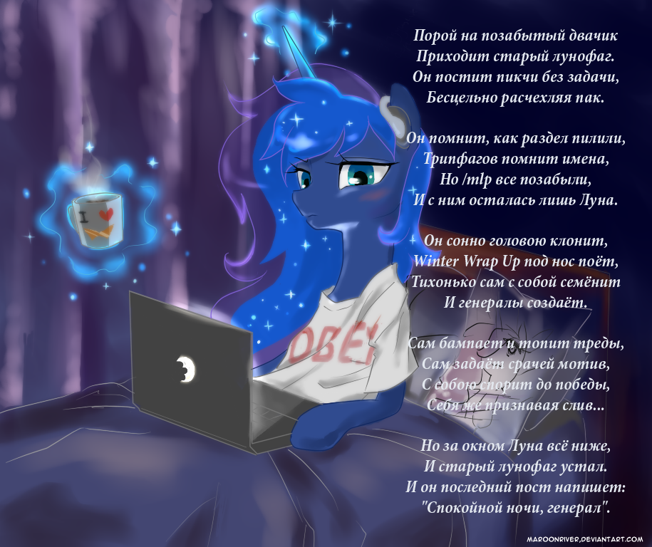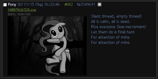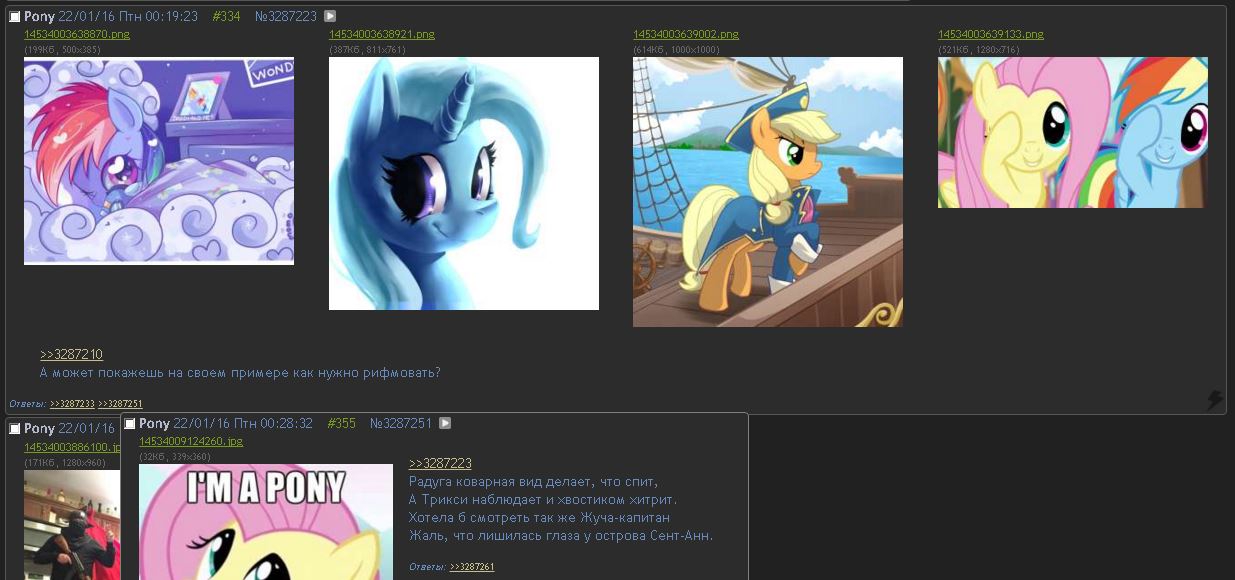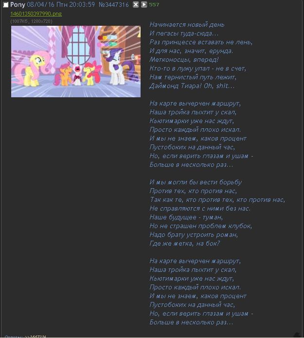 Заходите, не стесняйтесь, Каждый стул берёт себе. У компов располагайтесь, Открывайте /mlp. Раз уж в генерал попались, Вам помочь чуть-чуть хочу: Проводить постов анализ Я вас, дети, научу.