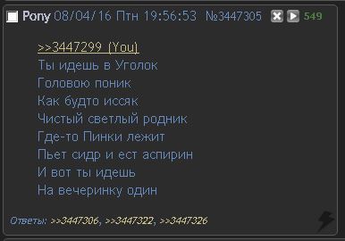 >>4427076 Смешно. Ей смешно, да, она просто рада, Да, рада, она просто видит пузырик, И ладно, и ладно - Плевать, что там в мире; От смеха ей хочется прыгать, да, прыгать, И в небо взлетать на своих серых крыльях. Из каждой из ветки появится листик; Верьте в мечту и идите за Дитзи: Она подтвердит, ну а в общем-то trust me: Пузырики - вот всë, что нужно для счастья.