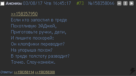 Если кто запостил в треде Похотливую ЭйДжей, Приготовьте ручки, дети, И пишите поскорей: Он клопфики переводит? На упорыша похож? В треде толстоту разводит? Точно. Слоу-конеёж.