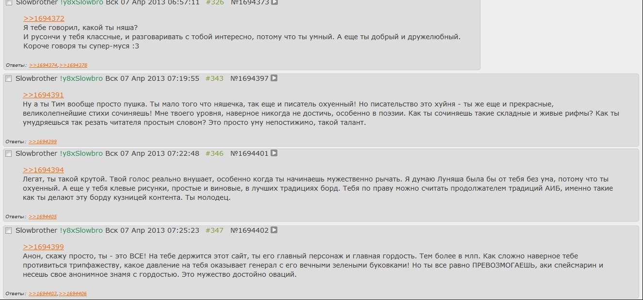 >Look at my horse, my horse is amazing! (\ >А были бы у вас жеребята, не грустили бы. >А какой смысл? Это же цирк ради цирка. Театр абсурда, помноженный на тупорылые крывляния. >А чё он такой коричневый наглухо? >А что этот тред представляет собой без вниманиеблядского цирка? Что останется от треда? >Аноним, начитавшись книг В.Улчера, решил саморазвиваться через просмотр поней. Уж лучше бы он палатку из полиэтилена зимой решил поставить в лесу, хоспаде... >Вайнона недоверчиво на меня смотрит. Потому что я мутный тип. Вайнона такая недоверчивая >Да уж. Вот и конец настал. Можете закрывать /mlp/. Всё равно лучше времён уже не будет. >Ещё одна страница сгорела... >Карочь, хер забил, всё само разрешилось. Я сотрудник месяца. >Кто мяукнул, тот кот. Мяу! >Луняша спит - едим тортик >Не очень люблю когда я могу случайно очернить свой ник, или опозорить представление о себе, и при том меня все таким запомнят. >Не хочу быть генералом, хочу быть понитредом! >Отмой свои мысли, отмой свой разум. Испей млека Кобылы Солнечной и освободись от страстей земных, ибо все мы едины под Солнцем. >Попробуй в следующий раз не постить такой дарк-контент :3 >Сахарок, мамашу твою, а ну, иди сюда, кексик сладенький, а? Сдуру решил ко мне лезть, ты? Поняшик мурзенький, мать твою, а? Ну, иди сюда, попробуй меня обнять — я тебя сам обниму, пусяшик, конеёбушек слоупочный, будь ты затискан! Иди, няшунька, целовать тебя и всю твою семью! Иди сюда, ты, поняшка, жопа! >Тебе в р34 тред. Тут читают только библию >Трудно ли стать брони? >Ты же красивый, небось много девичьих сердец разбил. >Ты салат, поганый, фетиш! Ты нам щас за все ответишь! >Укнижить, обТвайкать, и поняшить. >Уняня! Чмокать, обнимать, цаловать, кормить мармеладками. Фффыр, фыр, фыр! >Фотофинишь небось? >Хммм, какой бы на него навесить ярлычек?.. Может няши? >Хотел соединить слова Жираф и Пуся, но как то не прилично получается. >Хочу целую бочку варенья да целую корзину печенья >Это называется разделение обязанностей. >Это парни "ЧВК Пирожок", которых отняшили сегодня. Ещё ККНГ свежее. А теперь слушайте меня, пуси, это чьи-то отцы и чьи-то сыновья. И те лапочки, которые не дают тильды, блин, будут в конфе жрать их повидло. У нас нехватка тильд 70%. Сомбра, Худоним, где, блин, тильды? Посмотрите на них, пуси! >Я делаю что? Я прихожу, здороваюсь и спрашиваю как дела, где вы тут видите призыв к обсуждению меня? >Я правда ничего такого не помню~ >Я тебя скоро укушу