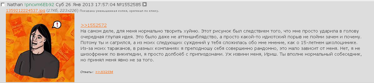 >>4426331 Да всем похуй. >>4426329 → Ты просто забыл и был в состоянии аффекта. Грифон, мне не хотелось этого говорить, но возможно у тебя диссоциативное расстройство личности. Я раньше не понимал, почему ты часто удалял сообщения, но теперь я всё понял - тогда это была твоя другая личность. И то сообщение про деанон ты тоже удалил. Учитывая твоё детство и школу это не удивительно. Одна из твоих личностей хочет тебя уберечь от треда, огородить от злых личностей, что тут сидят уйти из него. Ты же, сейчас, хочешь остаться в треде, попытаться самим сделать его лучше. В тебе внутренний конфликт, я вижу это, и видел раньше.