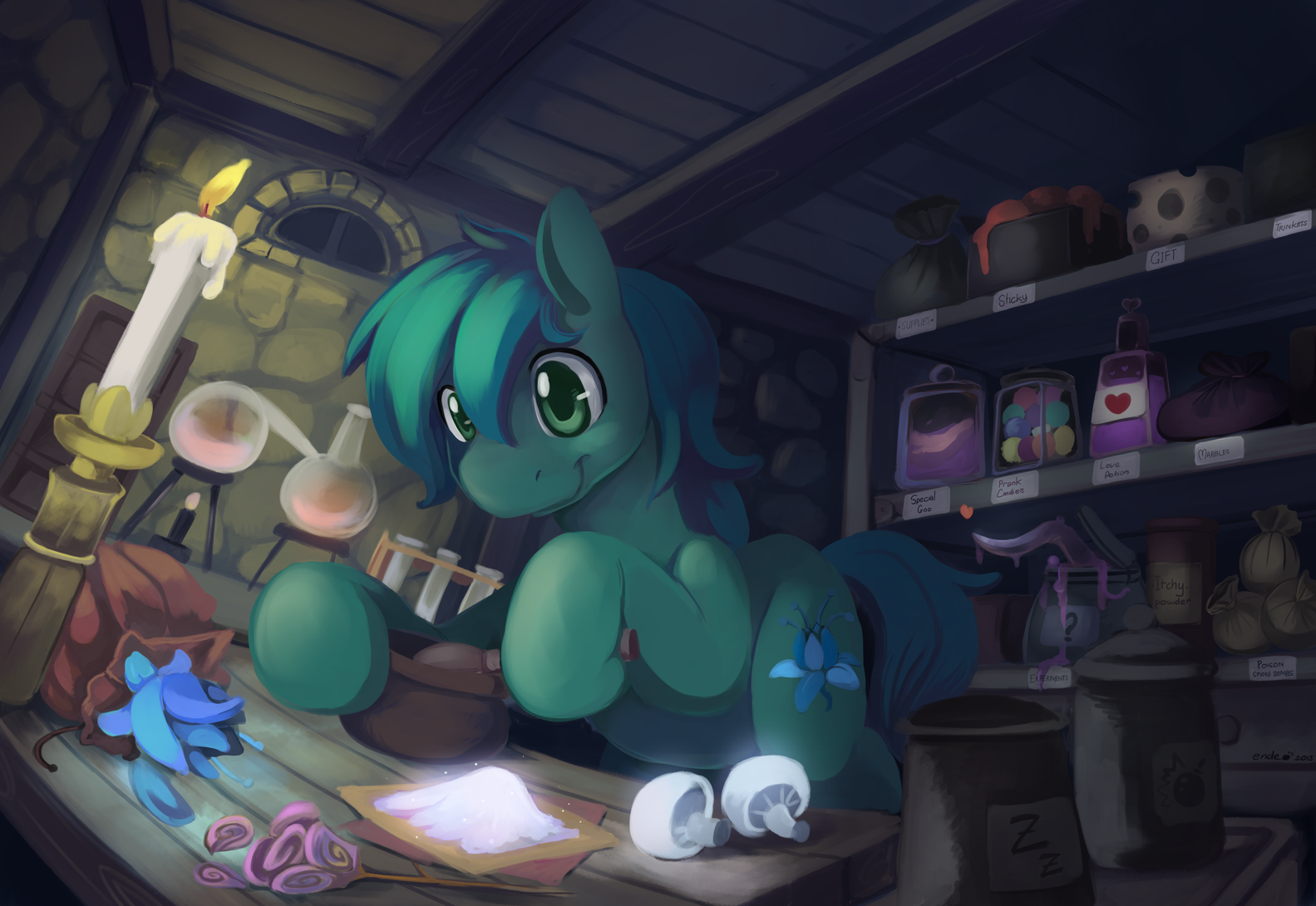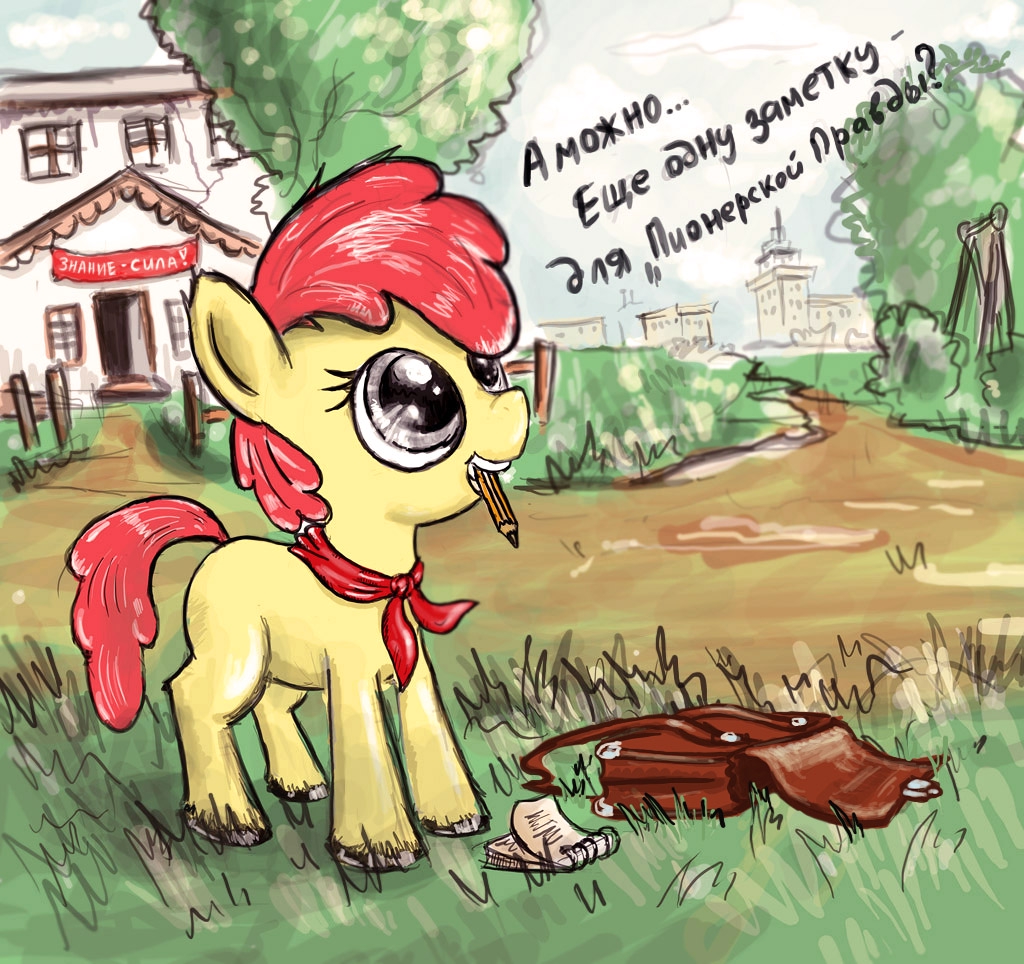 Рядом с ней старина Гранни Смит нетерпеливо поглядывала на пузатую бутылку яблочного бренди. Скуталу скучающе смотрела в магический экран своего мини-кристалла, её подруга Свити Белль пыталась справиться с сильной икотой — от попыток задержать дыхание она вся покраснела и запыхалась.