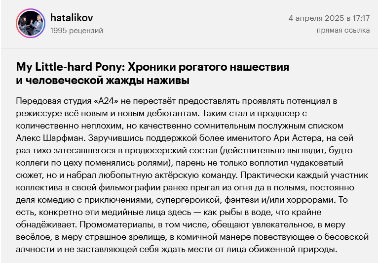 >>4431926 А24 действительно интересная студия. Посмотри описания других их фильмов. Они очень сильно отличаются от блокбастеров. Спасибо что напомнил про этот фильм. Хотел его посмотреть.