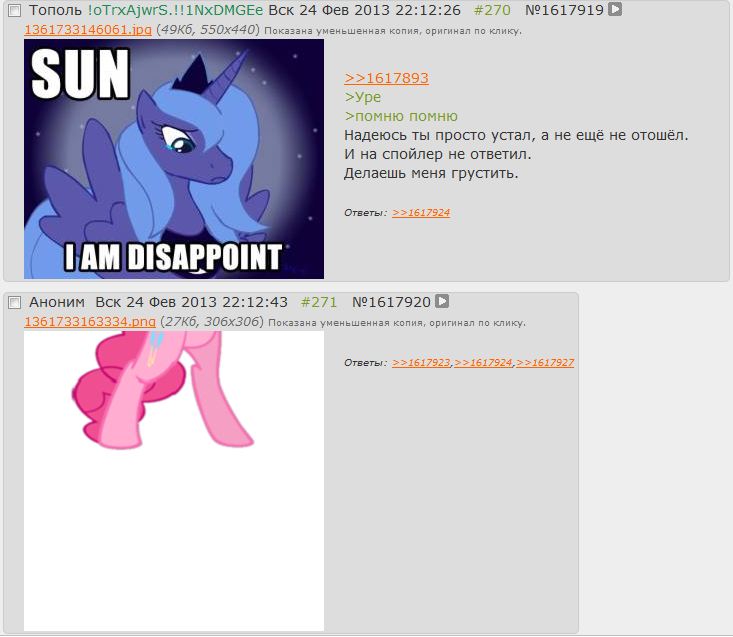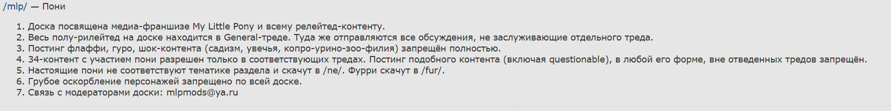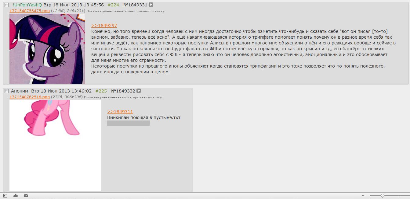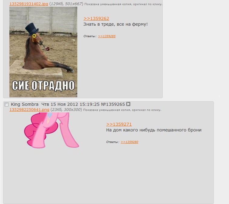 Да были бы понитреды постоянными, я бы и дальше доску игнорировал, разве что бупнуть пару тредов по старой памяти. Конечно, смотрящим за доской было неприятно, что контингент её игнорирует, они думали, что после запрета тут постинг небеса пробьёт, ага, всё так и было, только ненадолго, не всем по нраву пришлась местная духота.