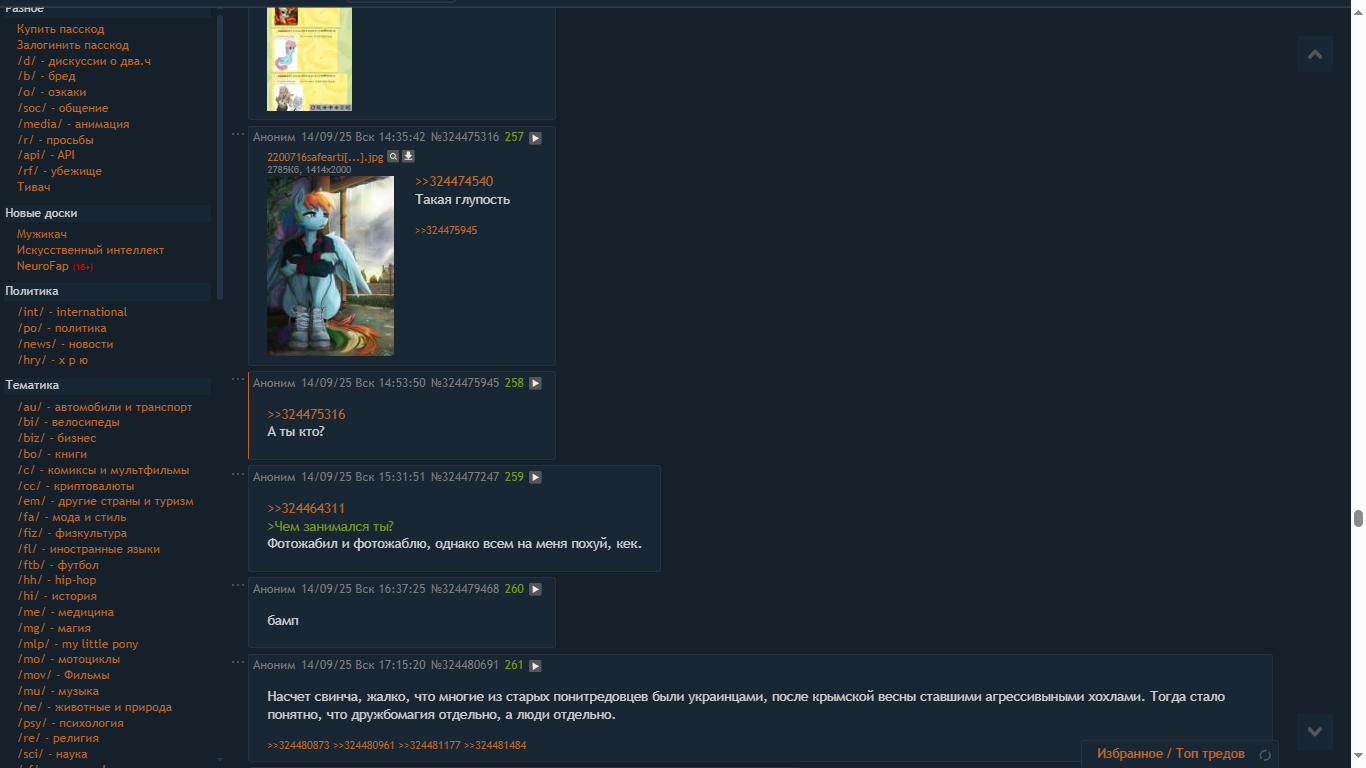 Здорово пацаны. Недавно в голову ударило ещё раз помастурбировать на лошадей, вспомнил про вас, и решил всё таки, что ничего страшного не случится, если я иногда буду сюда возвращаться поболтать. Можете объявлять меня пиздаболом и вниманиеблядью, будете правы, но практически полное отсутствие социальных взаимодействий и скука делают своё дело. Привет.