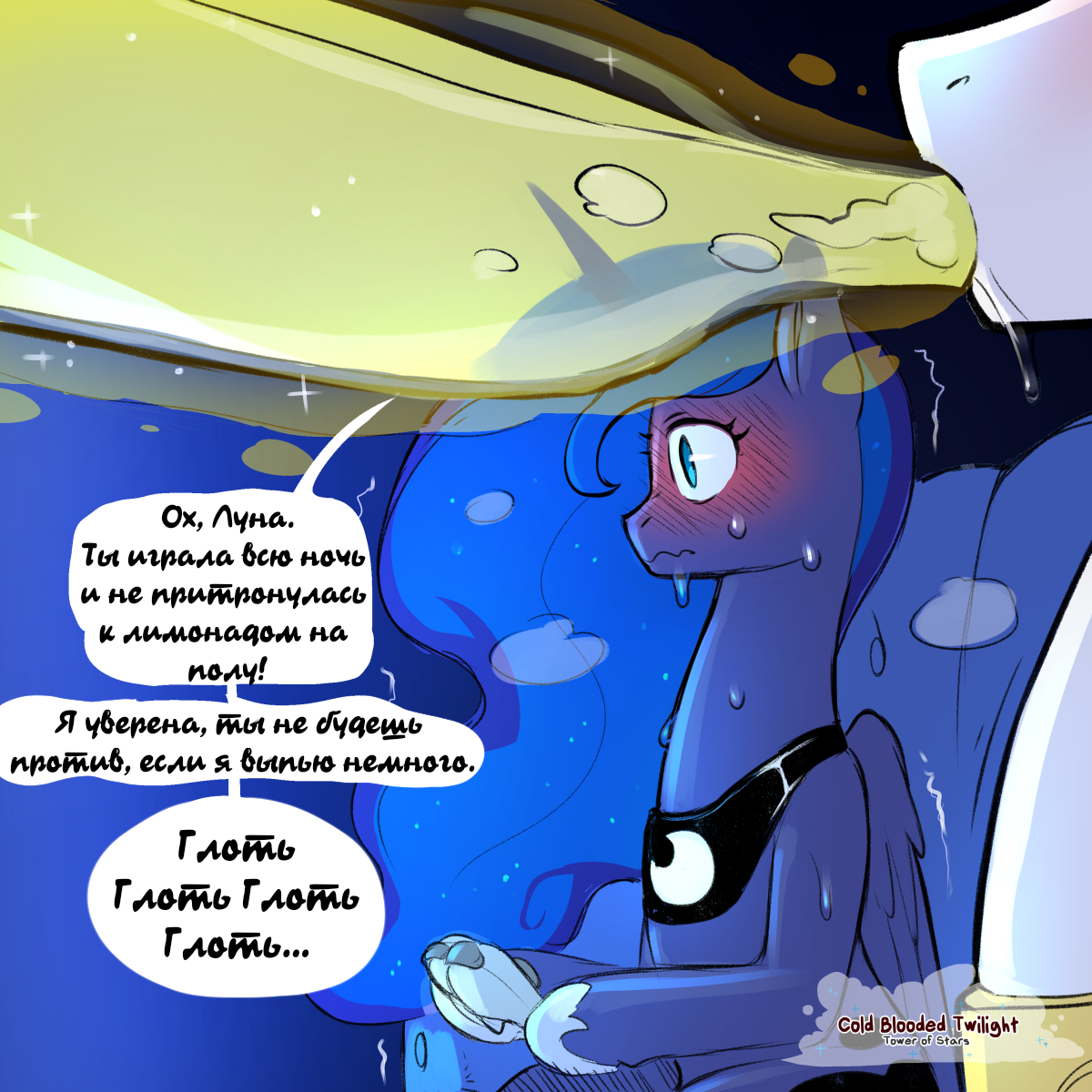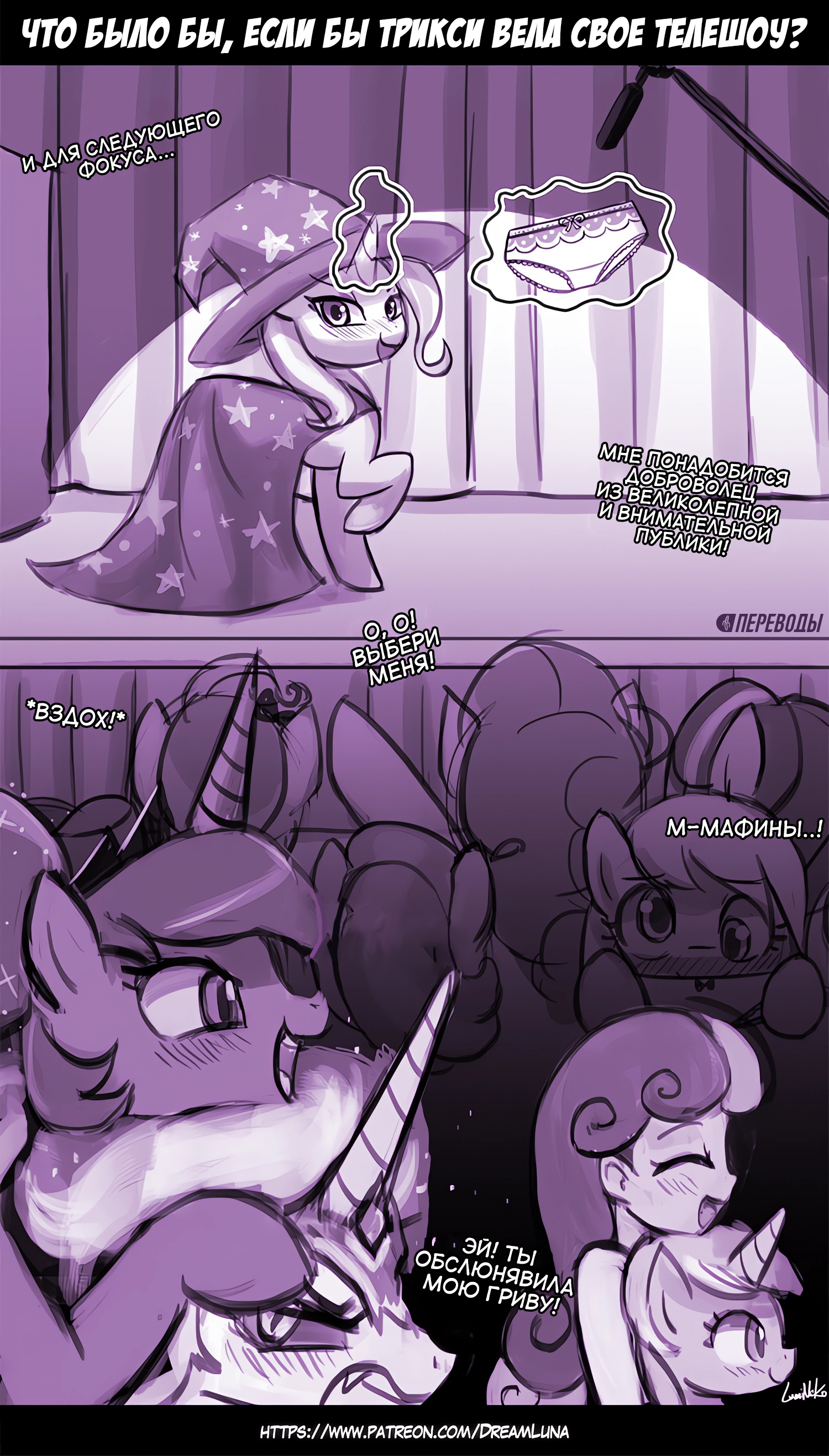 Тишину нарушил только голос Вулчера: "Довольно! Немедленно прекратите этот балаган! Лиза, отведи Луну в медпункт. А тебя, Родя, я провожу к директору. Будем разбираться."В этот момент из туалета раздался дикий визг и в комнату влетел сыч Сипуха с пионерским горном в торчашим из задницы ..