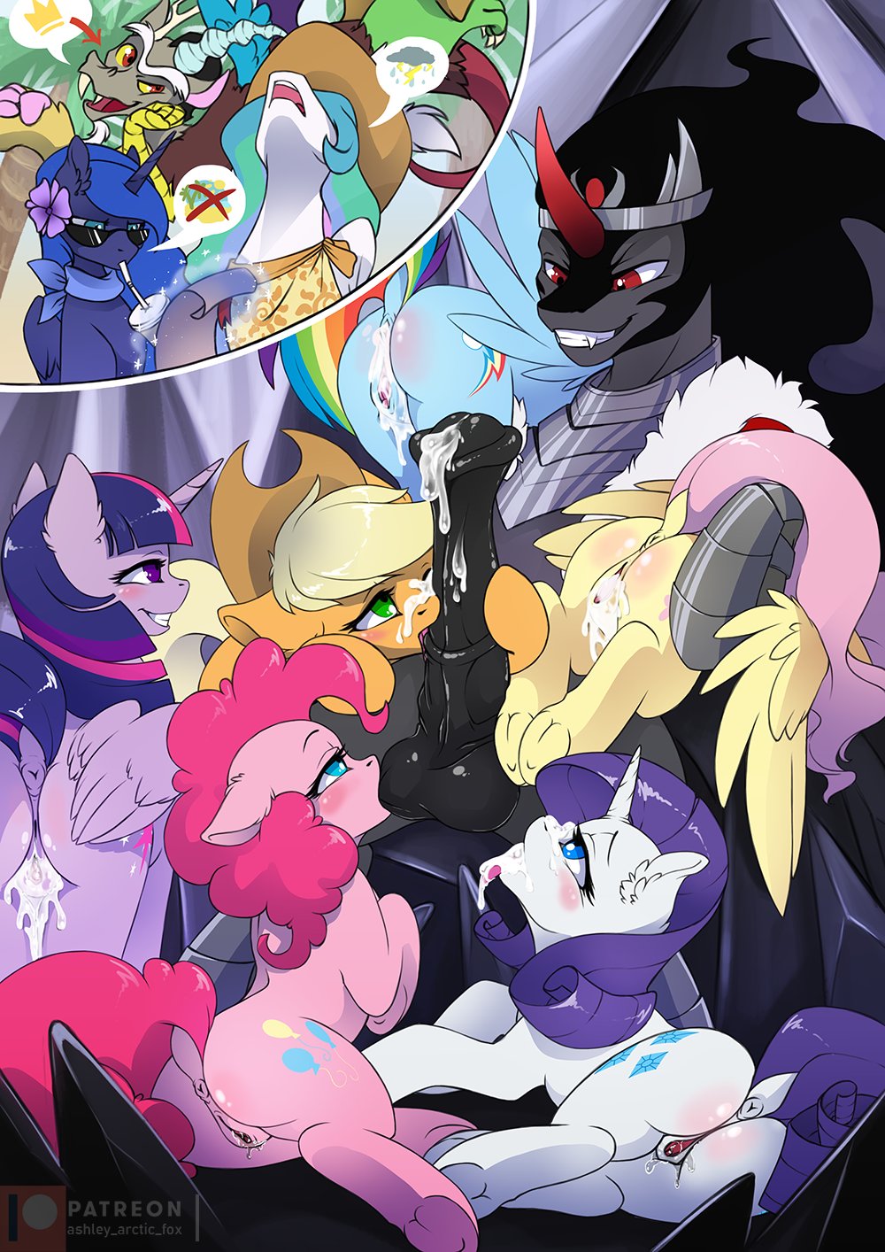 А Сомбра лишь усмехался, наблюдая, как его семя вытекает из уголков рта Каденс, капая на золотой трон. Его взгляд не отрывался от Фларри, смакуя каждый миг её ужаса.