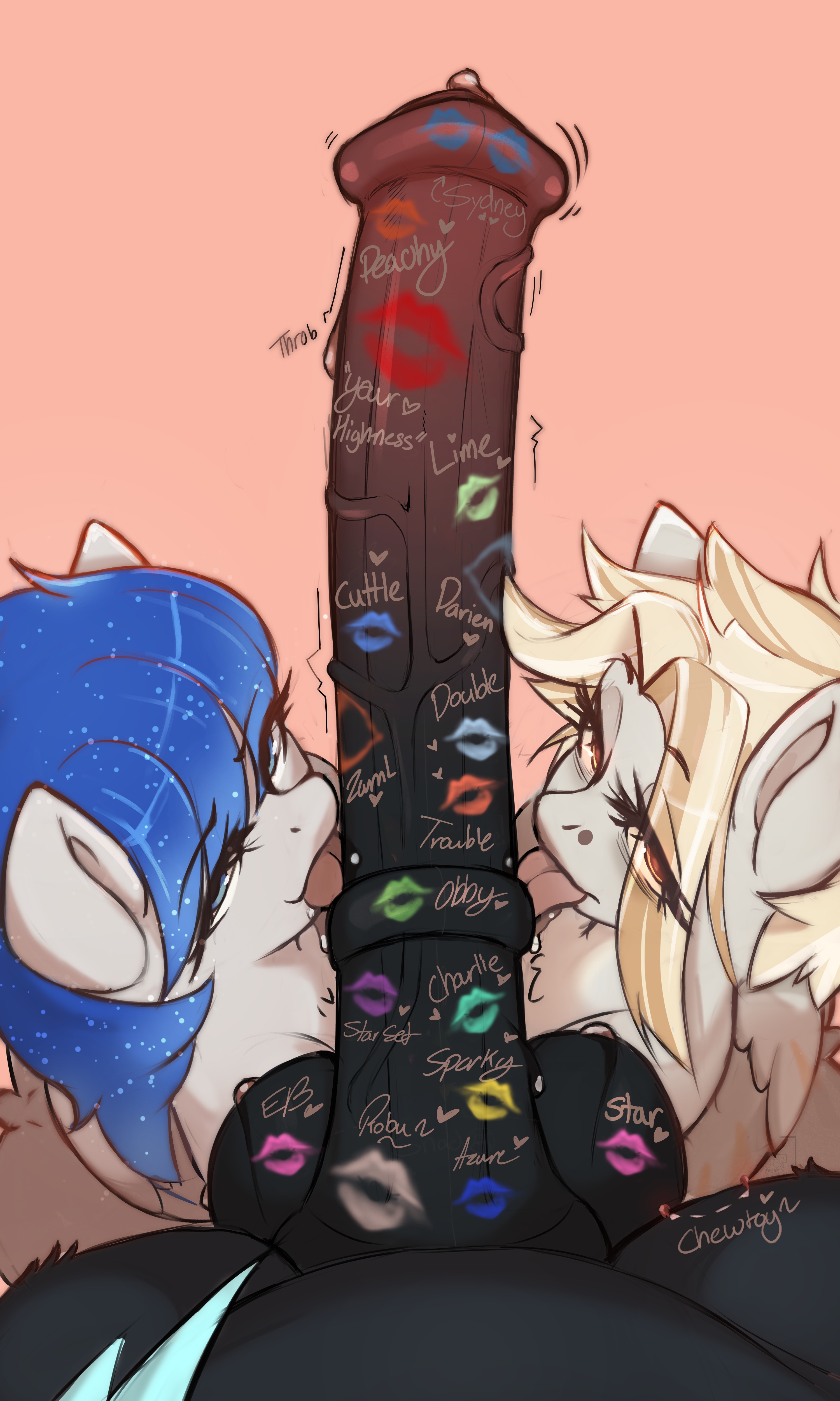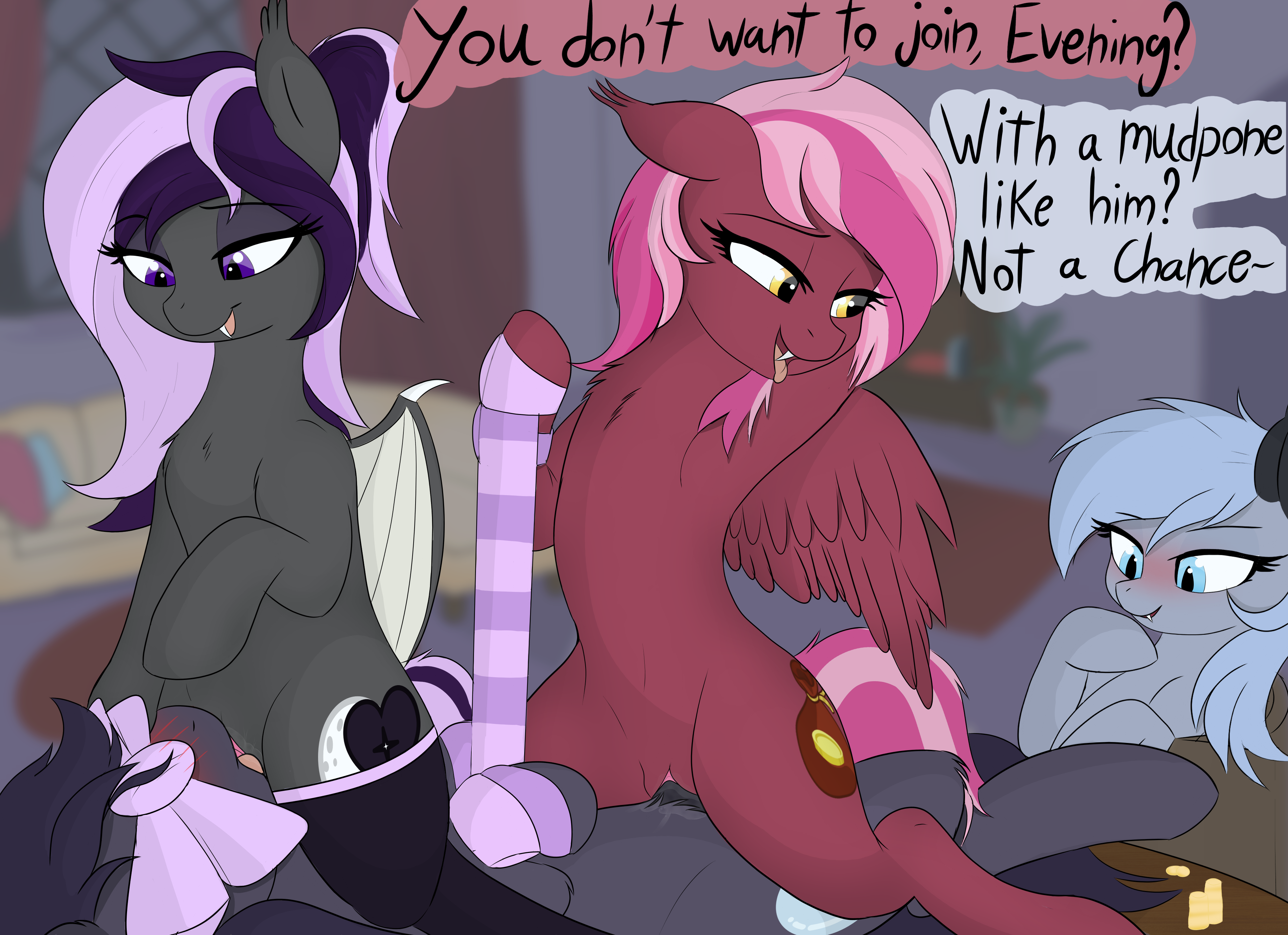 На троне, развалясь с демонской негой, восседал Сомбра. Его тёмно-серый член, толстый и испещрённый прожилками, был направлен вверх. У самого основания, прижавшись мордами к его плоти, сидели её родители.