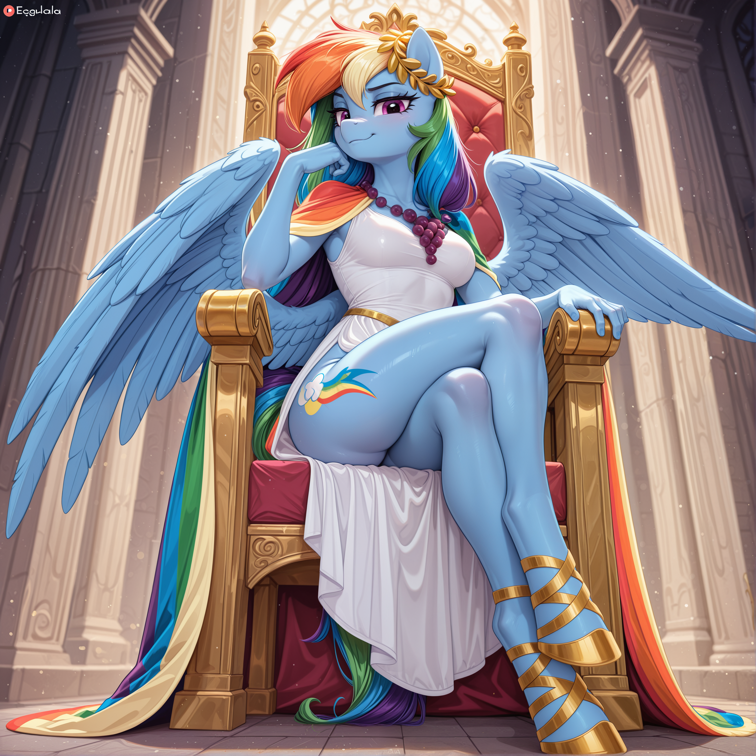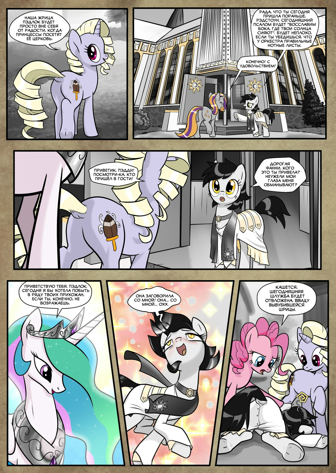 Холодный мрамор пола леденил копыта Фларри Харт, когда стражники грубо подтолкнули её вперёд. Воздух в тронном зале был тяжёлым, пахнущим ладаном и чем-то тёплым, животным, знакомым и оттого ещё более унизительным. Её взгляд скользнул по знакомым очертаниям зала, задержался на золотом троне… и она застыла.
