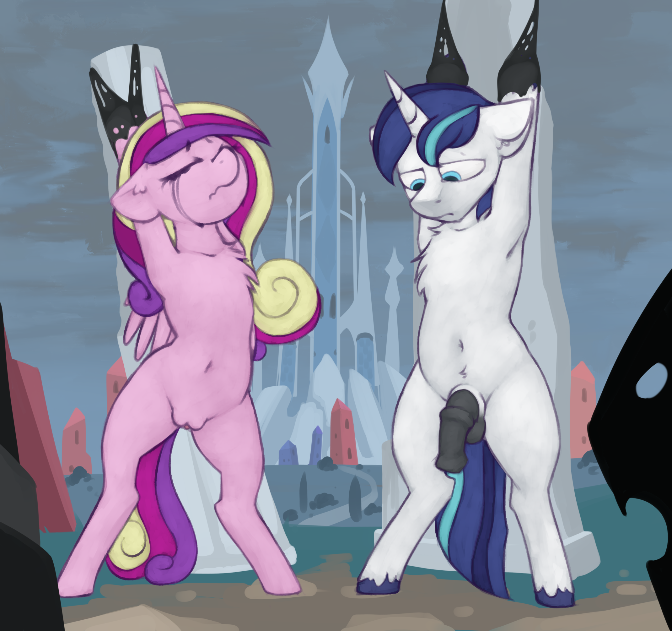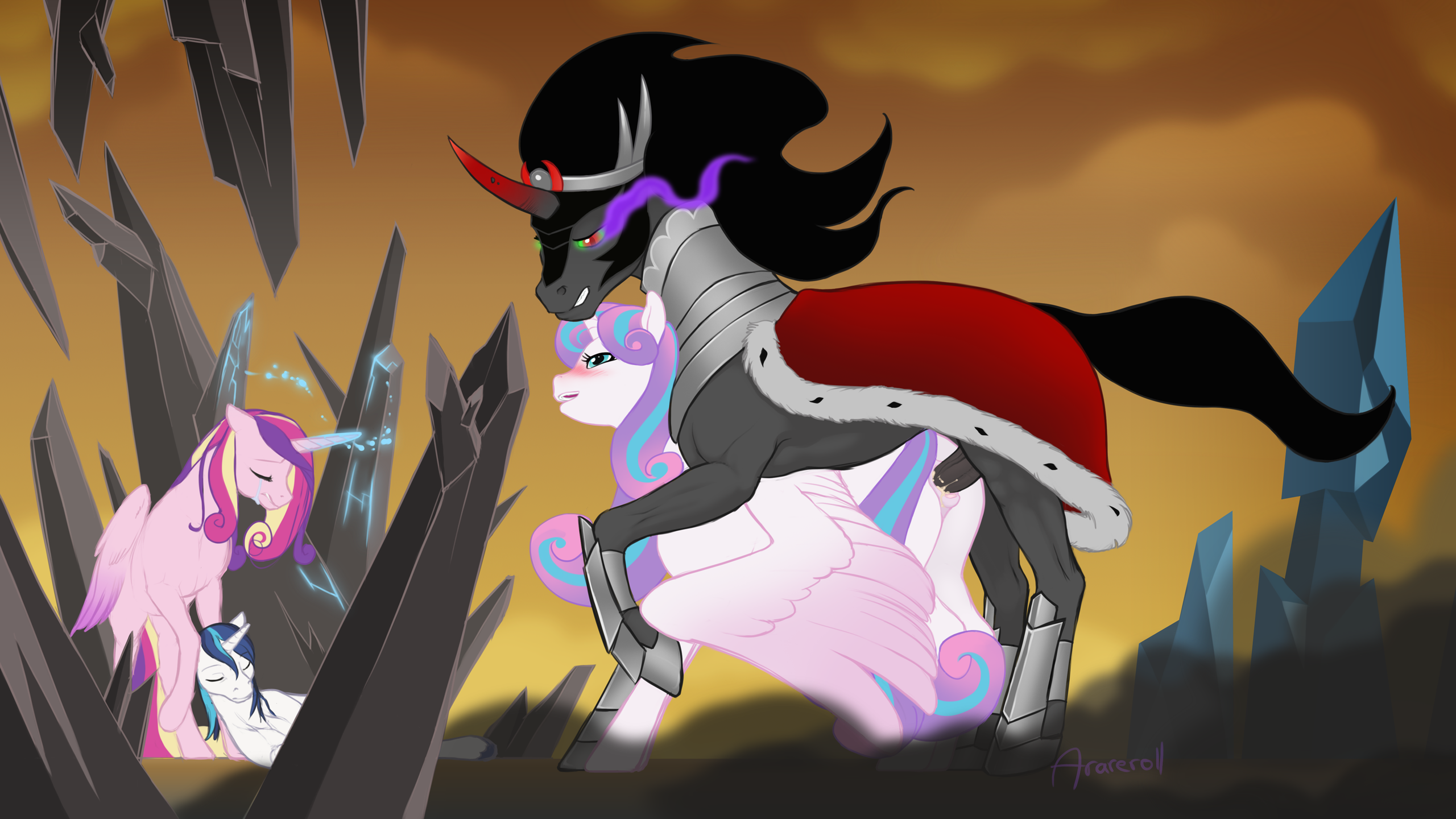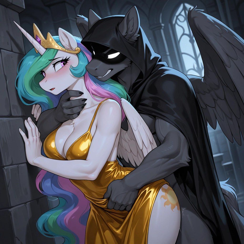 King Sombra licked at Cadance's helpless swan like neck as she tried to jerk away from him. Her husband watched as her naked body squirmed in the tight red rope harness. She pleaded Sombra to stop squeezing her supple breasts. But there was something hypnotizing about his embrace. The aura of terror.. domination… sheer masculinity… soon her pleas just became silence as she bit her lip. Everything was wrong, but she just couldn't resist. She looked over at her helpless husband and mouthed "I'm sorry, shining…"