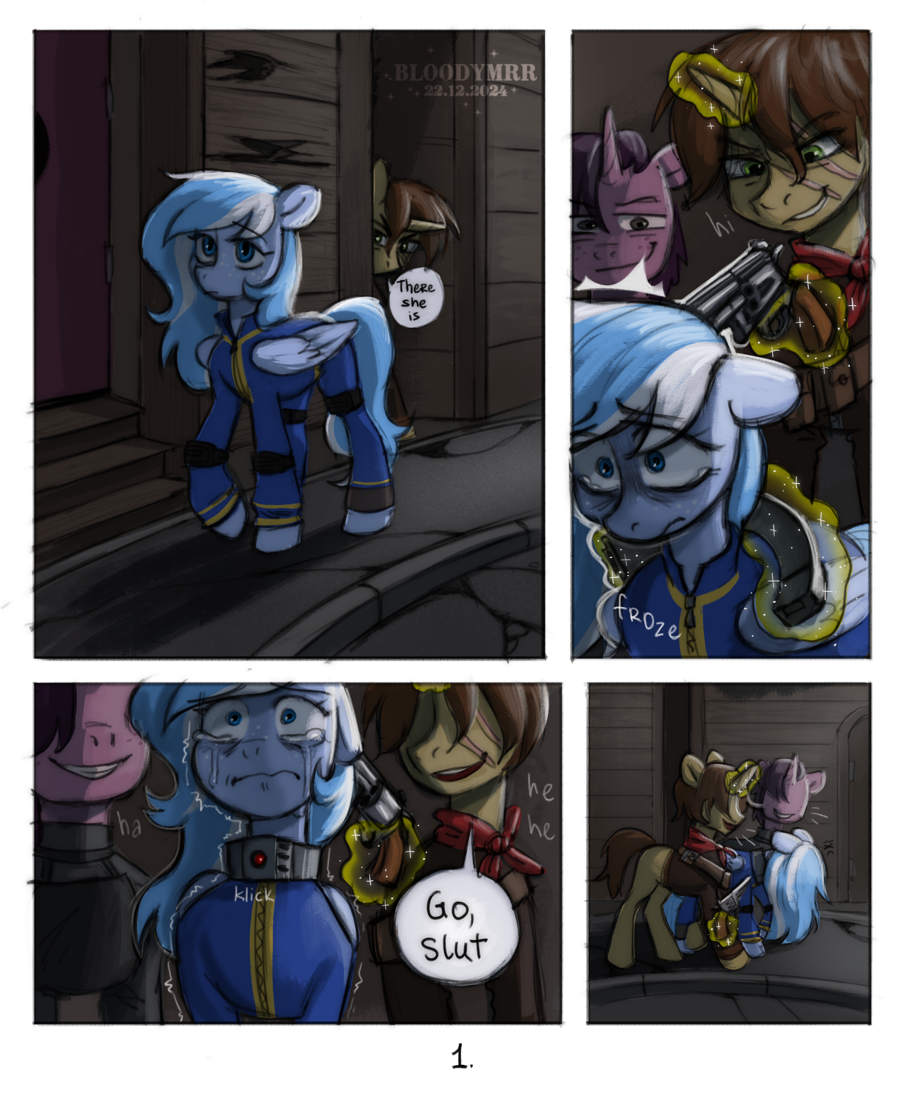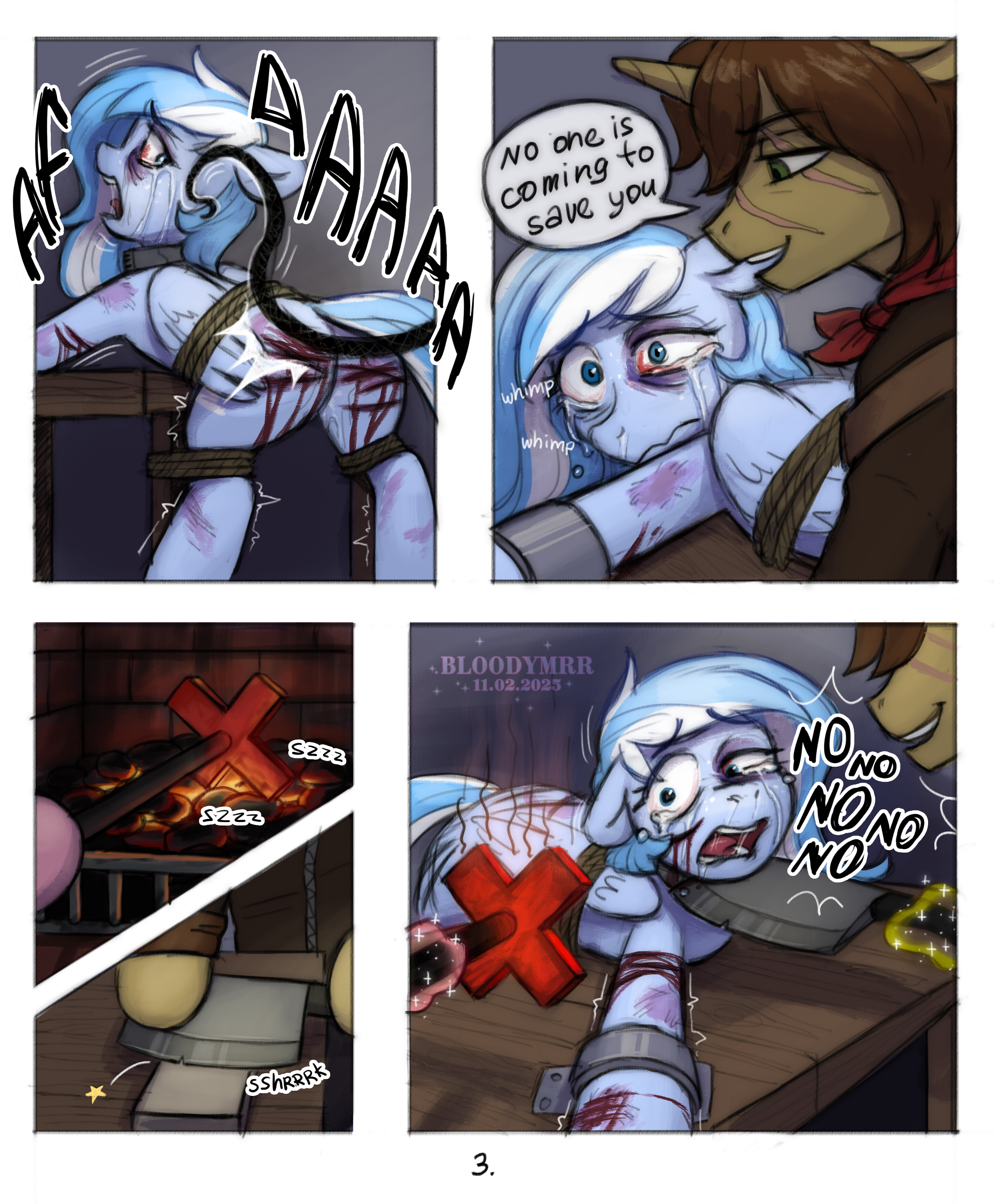 Каденс смотрела на него с немым ужасом, когда он приблизил свою морду к её. Их губы встретились в самом отвратительном поцелуе в их жизни. Белая жидкость перетекала из её рта в его, капая на их шерсть. Их тела дрожали от отчаяния и стыда, а Сомбра наблюдал за этим с довольной ухмылкой, его копыто всё ещё лежало на спине содрогающейся от тихих рыданий Фларри.