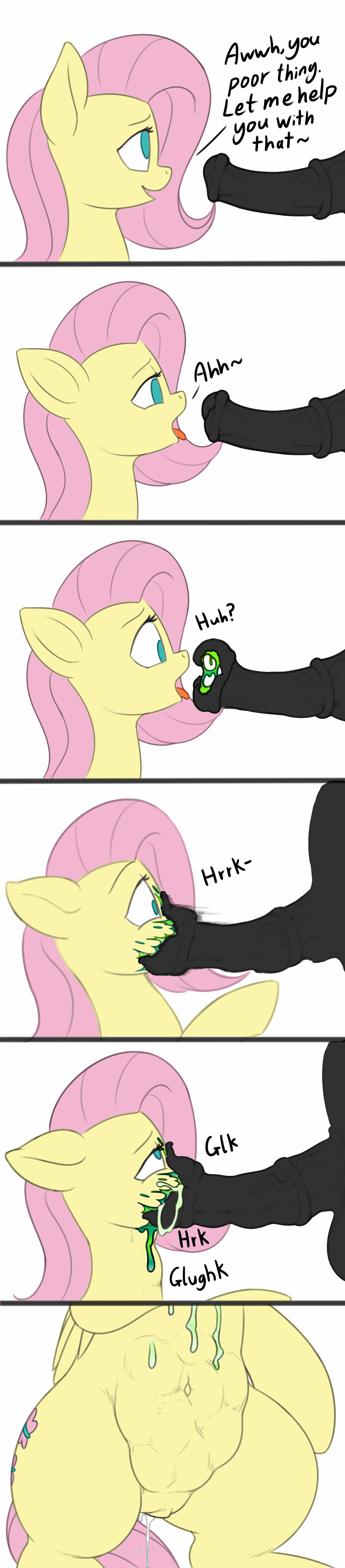 Каденс ахнула, её глаза расширились от шока и унижения, но сопротивление было невозможным. Её челюсти разомкнулись, и Сомбра направил свой пульсирующий член прямо в её открытый рот. Новые, более густые потоки семени хлынули ей в глотку, заставляя её давиться и кашлять, слёзы ручьём текли по её щекам, смешиваясь с белой жидкостью на морде.