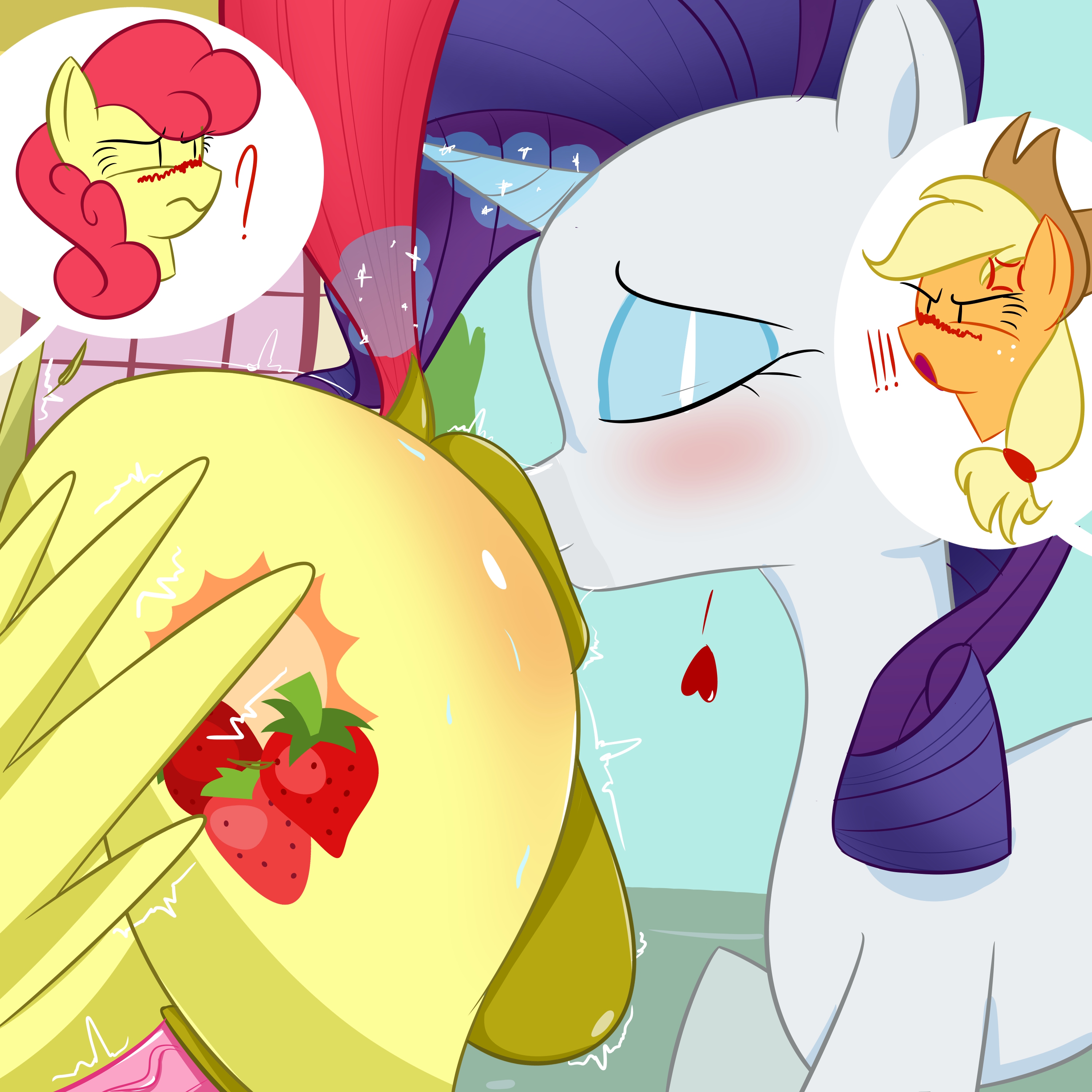 Каденс замерла, её глаза расширились от нового витка унижения. Она сидела с набрякшими щеками, пытаясь не сглотнуть, слёзы струились по её морде.