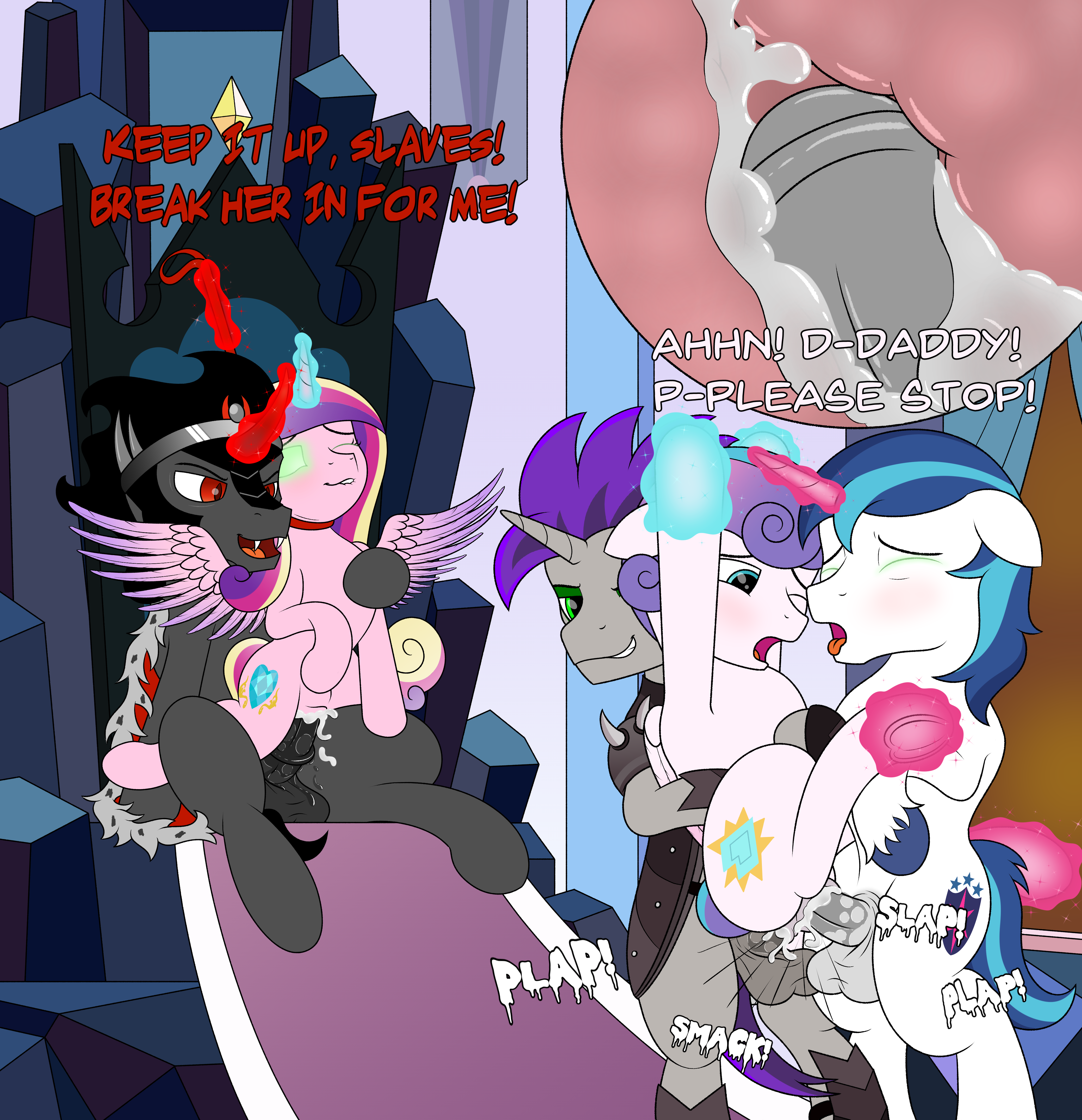 Flurry Heart's life was never the same after her wedding night. It seemed like whenever Sombra wasn't busy with other matters he would go out of the way to find her. It didn't matter where she was or what she was doing or even if there were other ponies around to witness it. He would grab her and violate her with no remorse right then and there until he was satisfied. She felt less like his queen, like her title said she was, and more like his sex slave. Her heart sank once she realized that each time he used her, she enjoyed it a little bit more than the last.
