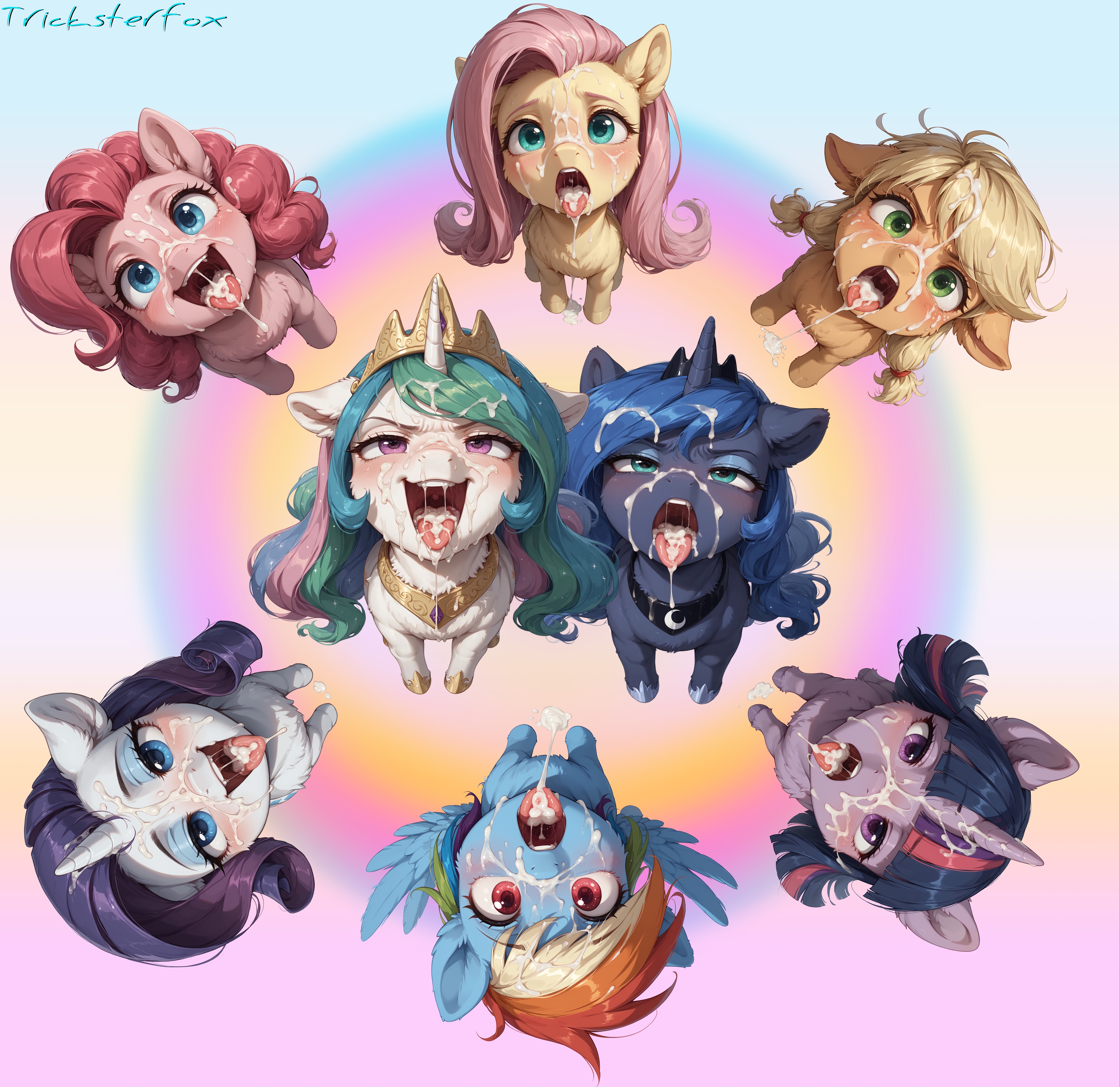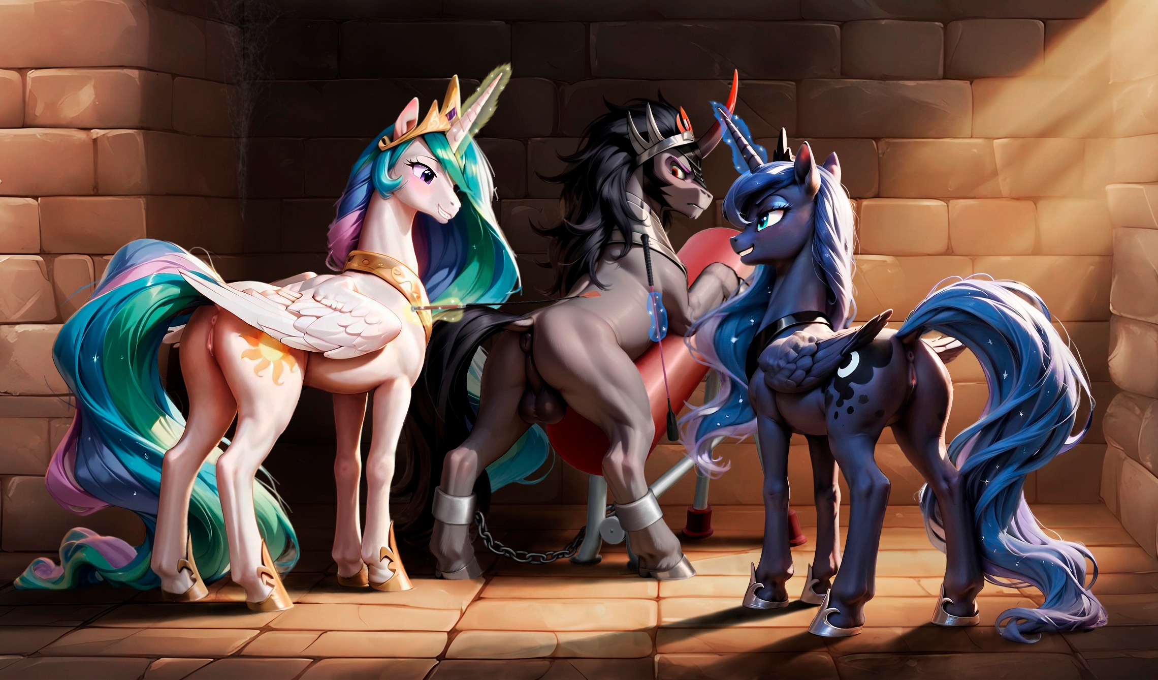 His mind was divided between Cadance's wet pussy milking his shaft, and the many dirty things he was going to do to that helpless guard captain. He imagined him in tight leather, elaborate rope, chains hanging him from the ceiling, with that thick cock locked in a chastity cage. He had captured his sister and her friends, so maybe he could do something to him in front of her… or with her…