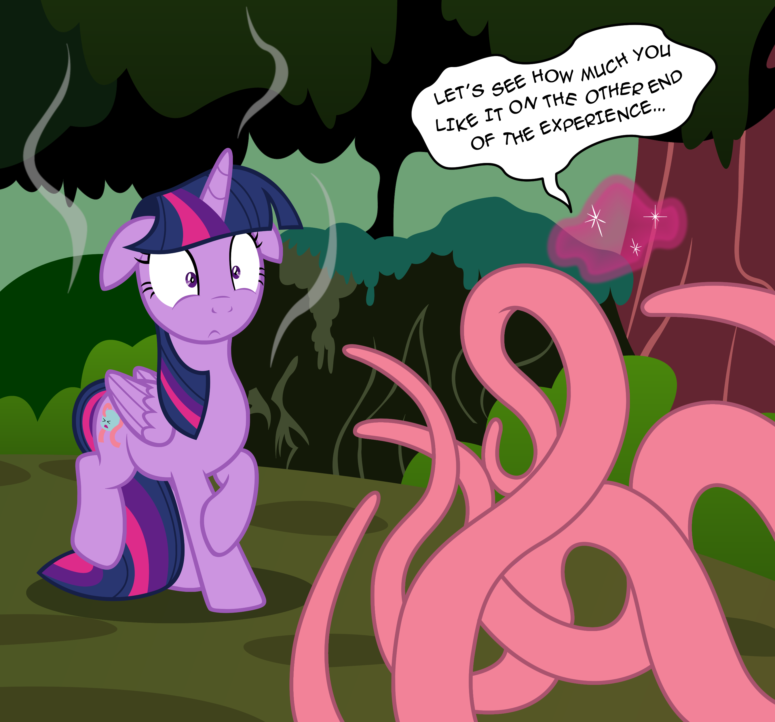 Твайлайт поворачивает голову, ее грива прилипла к влажному полу. Ее глаза отражают не потерю управления, а глубокую концентрацию, будто она продолжает вычислять даже в такой ситуации. Стабилизационный ритуал требовал симбиотической связи... но я не предвидела такой физической интерпретации.