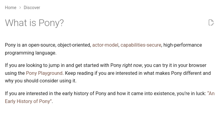 > why it’s called “Pony”? > Back in the flight sim days, when I would make my friends groan by telling them yet again about all the things I was going to do when I wrote a programming language, one of the people I would tell was Nathan Mehl. And one time, when I gave him yet another laundry list, he said: “yeah, and I want a pony”.