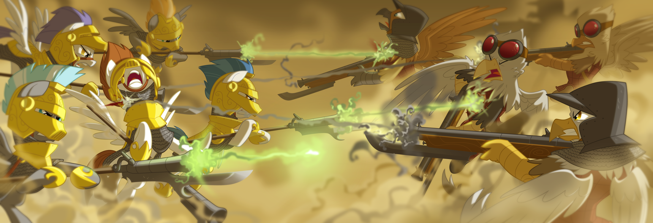 Вкратце о сеттинге - Луна и Селестия в один прекрасный день куда-то пропали, но смена дня и ночи продолжилась без их участия, что привело сначала к бунтам, потом и к распаду страны на несколько разных лагерей, с покровителем из бывшей М6 в каждом.