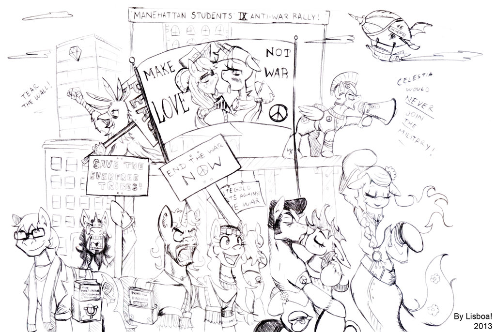 Вкратце о сеттинге - Луна и Селестия в один прекрасный день куда-то пропали, но смена дня и ночи продолжилась без их участия, что привело сначала к бунтам, потом и к распаду страны на несколько разных лагерей, с покровителем из бывшей М6 в каждом.