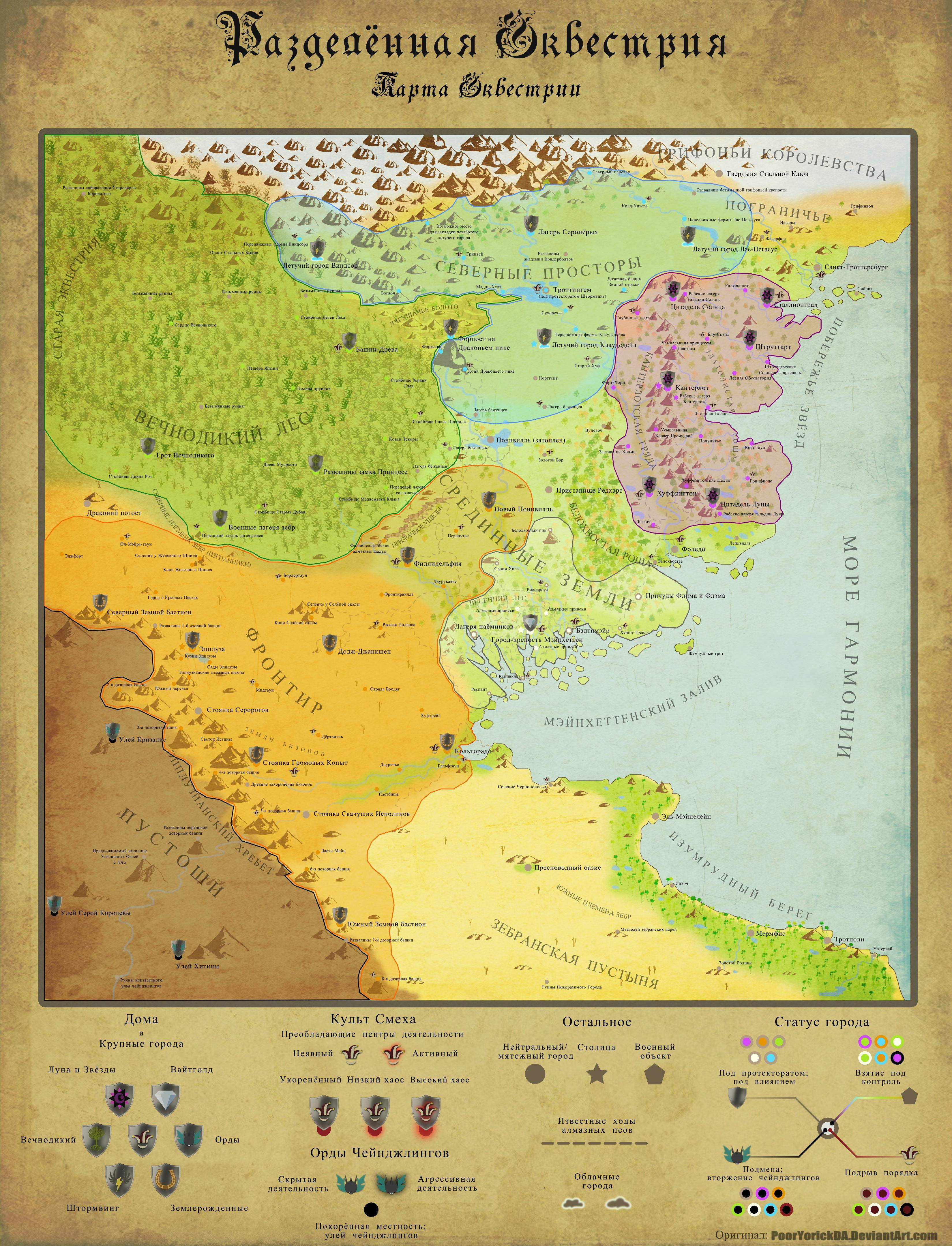 4) Дом Вайтголд. Единороги, пегасы и земнопони, не приемлющие тиранию других фракций, основали торговую республику со столицей в Мэйнхэттэне. Главой Дома является Рэрити, которая пробилась во власть путём интриг и манипуляций. Окопались в городе-крепости Мэйнхэттэне, сохраняют нейтралитет, своё получают в основном за счет торговли и крайне мощной шпионской сети по всей Эквестрии. Армия невелика, но для обороны этого достаточно. К Принцессам нейтральны, рвать жопу за них не будут.