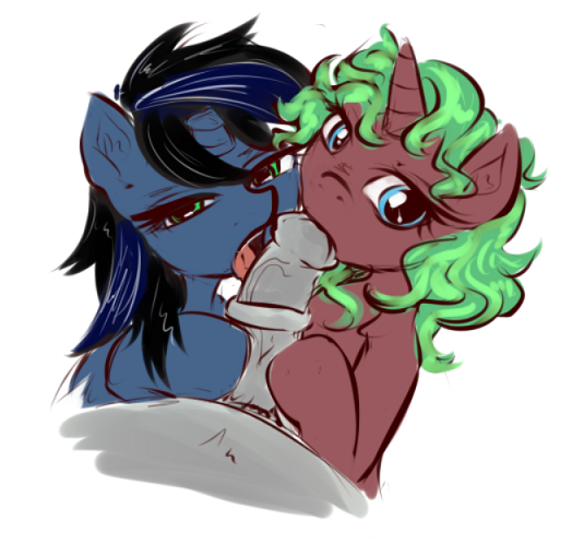 >>93016 Только что покинутый другом Терновник не успел заскучать, ведь ему в награду достался невыносимо сладкий, совершенно нежданный поцелуй друга. Ноги у него подкосились, и он лишь жадно впился в губы в ответ, проник смазанным в молочке язычком в распахнутый, приглашающий рот друга, лишь один язык и губы чуял он, вылизывал своевольный и ритмично скользящий язык синего пони, щёки, нёбо, перемешивая слюни и молочко в сладчайший нектар на троих, которым грех будет не поделиться с Экви. Очнувшись от невыносимого трепета Терновник первым делом осознал, что у него внизу ритмичная, звонкая и труба, исполняющая мощную симфонию любви внутри Эквюшиного кожанного футляра, резонирующего - это шального поцелуя и потери себя у него проявилась синестезия, когда, например звук может чувствоваться в виде цвета, или запах в виде прикосновения. Так же запах губ и довольной ухмылки друга предстал перед ним упрямыми облаками, неподвластными ветру и задорно кричащими далёким пони внизу, что вот вот прольют на разгорячённых шалунов прохладный дождик. Экви же с благодарностью прильнула к агрегату синего пони, то неистово вылизывая головку, то нежно целуя бугристую поверхность от головки до уздечки, щекоча ноготками яички. Она вся перемазалась в его молочке и с наслаждением пила новые порции.