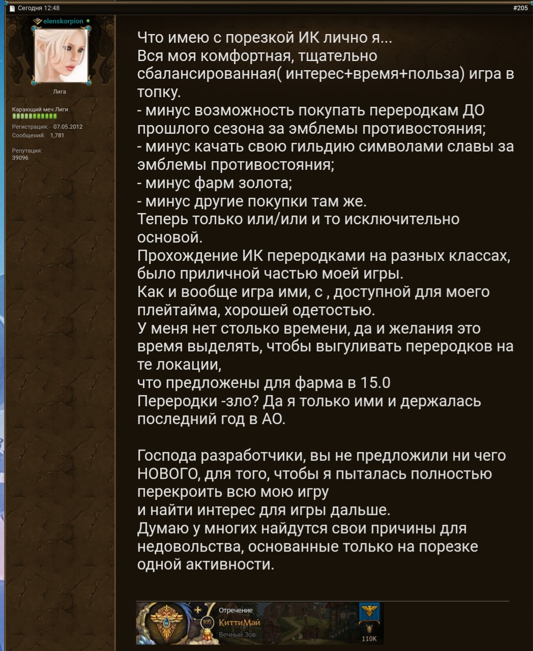 Вы забыли что ММО это другой мир где ты общаешься с другими людьми. Мне поэтому нравится гонять в Star citizen потому что я могу пукнуть в чат на кривом английском и мне ответят, завяжут диалог. Позовут куда-то. Я помню в аллодах было такое и в вовне. Когда ты общался в игре, вы могли начать общаться ирл, вы собирались шли куда-то, даже если это просто пойти Айденуса убить. Но главное что когда я кричал в мир "кто в рейд на Лигу к 11 на святой земле" и знаешь что? К 11 на святой земле уже шёл пиздорез потому что туда прибежала Лига и вот рейда уже нет есть просто пиздолово. Или "поцоны не могу пройти..." и тебе тут же инвайт в пати, бегут помочь и прочее. Сейчас тишина и "гайд прочти там в соло изи вообще". ЛФГ и автосбор на БГ вот и все.