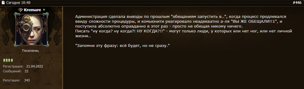 Играла с начала обт по ПТ, пару недель назад вернулась. На новый акк. Так-как забыла почту и пароль от ебаного мрг центра. Охуела. Во-первых, куда пропали пиво с водкой у друлей? Во-вторых, что это за аспекты ебать? В третьих, капец руны обесценились. Раньше, помню, даже 7 вкруг были круто. А сейчас 11е подавай людям. В четвёртых оно вообще живое? На АТ никого — никаких замесов у хт и на паучке. Хоругвь поднимаешь и никто не прибегает тебя убивать. На кирахе две калеки в скачках, на кроков никто не ходит, как и на у3. ОО/СО — ноль пульса. В астралке пяток людей, в мире срачей нет, никто пьяным не орёт. Донные гильдии имеют неплохие острова на чд..Что вообще за хуйня.