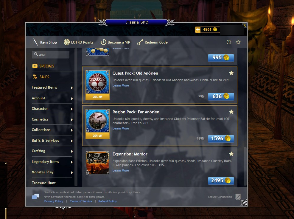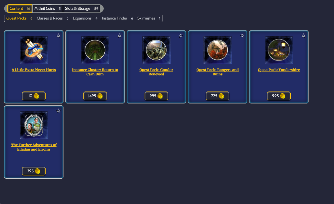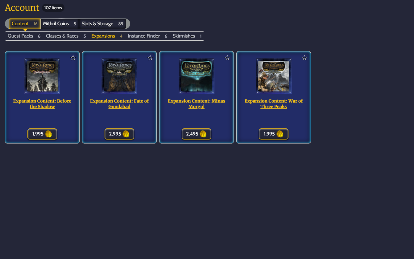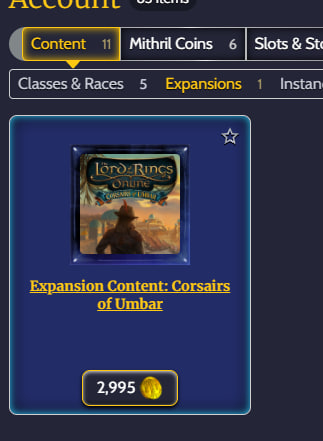 >>6626460 P.S. Если в магазине не отображается аддон/квест-пак/инстанс-кластер, либо он уже куплен, либо не вышел, как например текущий Умбар, который через неделю-две за поинты только появится.