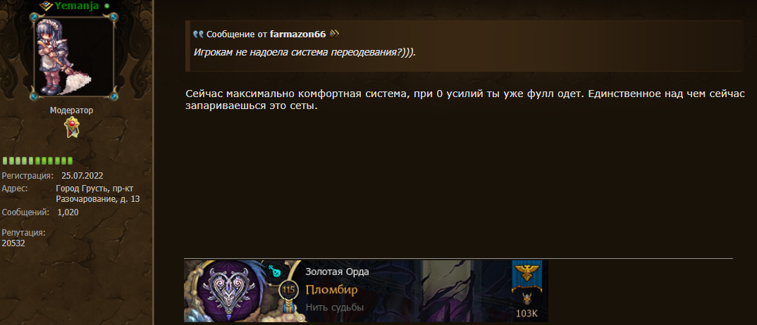 Я крч погамал недельки три после перерыва большого и щас выскажу непопулярное мнение старого деда пердеда, у которого молодость прошла в фармить-фармить-фармить-гангать-гангать-сратьподсебя Щас есть смысл хоть что-то собирать, относительно ранешнего - ДО сеты не сгорают и их потом можно апнуть до актуального. Это кайф. Стоят они неподъёмно для тех, кто ничего не делает, это не кайф. Собираю лафиа, а еще чего на мага не придумал брать, все пишут гарнекота но у него проки бонусов по сути только если не ходишь, а я бегаю как ебанутый постоянно. Хуево только то, что возможность вытащить сетовый шмот запихали еще и на Айрин, вроде и хочется как-то побыстрее все достать, а эти квесты там ну это ебать просто. А, ну и рулетка конечно тоже фантастика, за 15 вытащенных шмоток 2 нужных, 3 говна за сотку-две, а остальное голая параша по 20-30к на ауке. Не озолотишься крч. То что Тоха прогнулся под залетух и выкинул все страницы говна в пве фарм это тоже заебись, реальгародрочево было завязано на гильдии и время игры, а грааль бы никогда уже не вернули. Ток на статы долго алриат дрочить, ну хули делать. Визуал новый пробежал глазами - красивое местами, но ничего не зацепило, ну и ладно. Система одевания какая-то пососная для залетух стала, но чет я глянул там разница между первым и последним шмотом мощная, но между слоями не очень сильно, можно накрафтить себе до середины сезона шмоток цветов а до талого не крутить и будет в принципе сносно, но щас я конечно этого делать не буду и арт скрафтить не буду, через месяц большое обнуление. Бегаю, фармлю парашу, стукаю таких же нищебродов как я сам на цс, читаю гневные сообщения, в принципе весело. Все равно делать нехуй