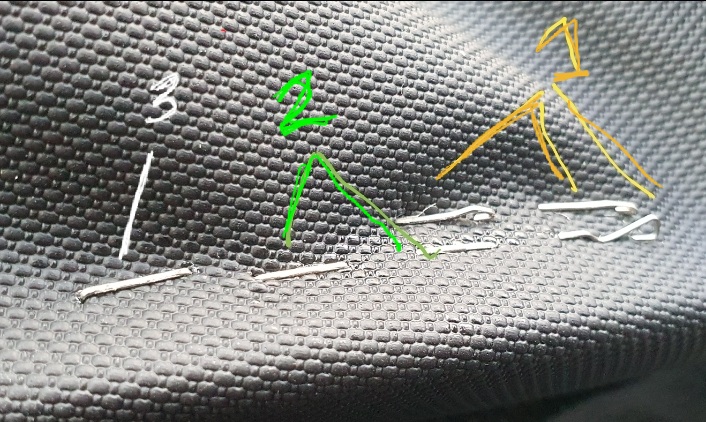 Для тех кто отважится на перетяжку сидений. ОПу чудом удалось натянуть материал, который тянется только в одном направлении (а именно вдоль текстуры). Он больше подходит в том случае, если у тебя подходящей формы сиденье (с прямыми гранями без скруглений большого радиуса), иначе получается большое количество складок на закруглениях (пик 1). Заебавшись в край, было затянута одно из двух сидений, потеряна мотивация, а сиденья отложены в далекий угол. Спустя полтора месяца взял жопу в кулак, купил другой материал, который легко поддается растягиванию. Разница просто огромная. А сразу подумал, что руки из жопы.