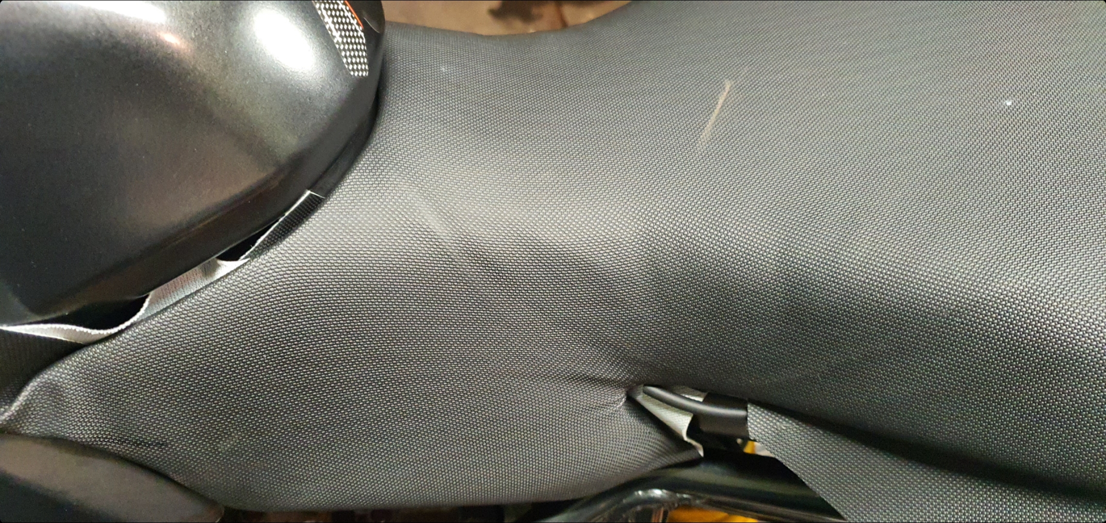 Пока что накинул сидушку на мот чтобы глянуть где провод вывести. Тут тоже оказалось что сзади неудобняк. Как-то надо придумать сбоку. Ну и пока сидел ёрзал жопой, думал может похуй что видно немножко при определённых углах этот край грелки? Слез и понял что теперь стало ещё виднее, а еслито так появилось за 5 минут, что будет через пару мес?