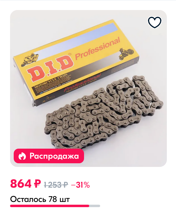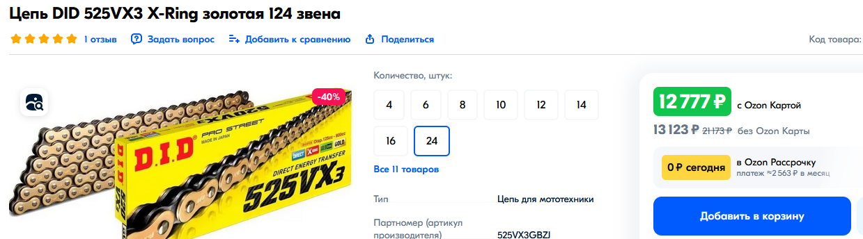 >>507808 Дожидаться критического износа цепи не стал, озадачился заменой. Пусть оригинальные каталоги говорят об установленном с завода DID и оригинальных звёздах, личный опыт требует не привязываться к брэнду, а искать альтернативы. Благо, на рынке выбор довольно большой.
