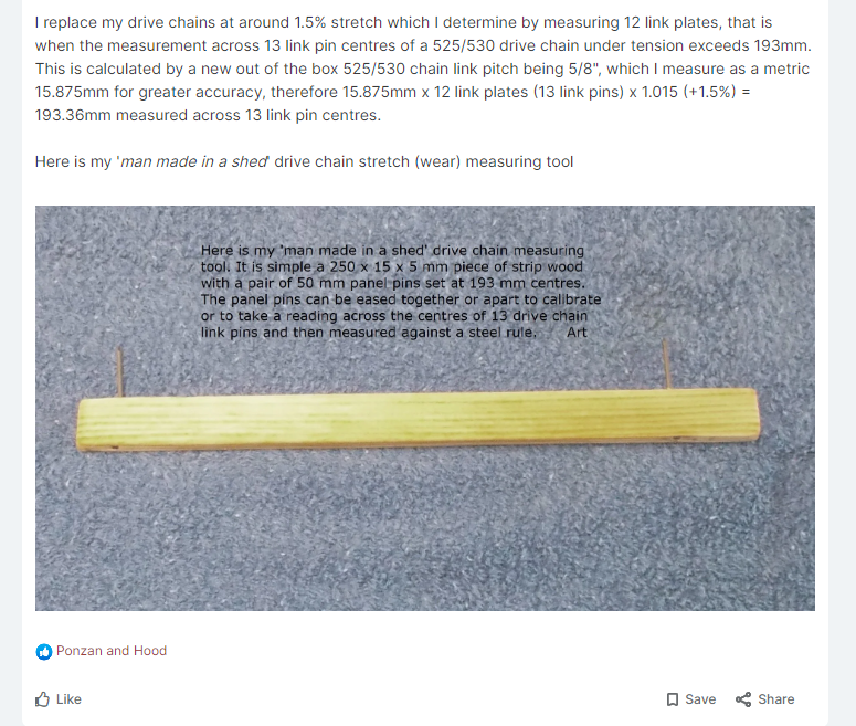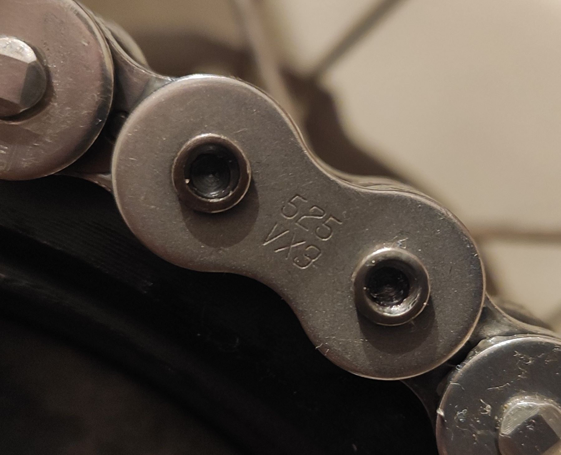 Лимит износа для цепей DID это 1% удлинения, для 525 цепи обычно замеряют 16 линков (потому что это ровно 10" или 254 мм на новой цепи) - предел это +2,5мм удлинения или 0,15мм на линк