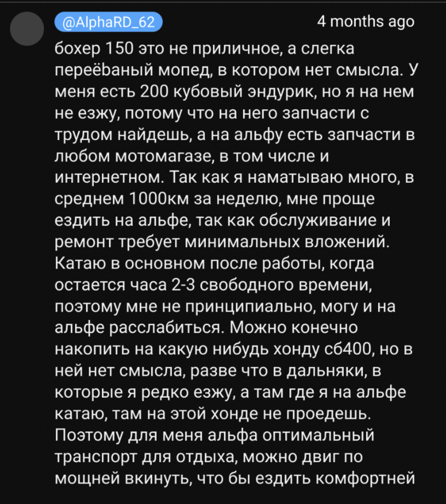 Сап мотач, Альфачам респект, остальным, соболезную. Очень рад, что нашел этот тред. На правах бампа хочу оставить свою кулстори, заодно, может, посоветуете что-нибудь (сделать бочку). Давно хотел купить недорогое тс для езды по своему недогороду, но мотошколы у нас нет, а на бричку нет денег (да и не окупится она, город маленький и я не так часто куда-то выхожу). Поэтому последние лет 5 обходился электросамокатом (был одним из первых кто купил себе эту хреноту, люди тогда еще подходили спрашивали, что это, сколько стоит, удобно ли лол. бзв, андеркат не делал, штаны не подворачивал). Но самокаты говно, хз как в больших городах, но в малых... Дорожек нет, водятлы считают, что их святой долг спихнуть тебя на тротуар, пешеходы, что твое место на дороге (я в курсе что симы должны двигаться по доп), да и дороги тоже наши сами знаете, а у самокатов диаметр колеса маленький, любая кочка или небольшое углубление грозит отправить тебя через руль. Сами самокаты долго не живут, за 5 лет покупал 2 штуки, один наездил примерно 200-250 км, второй 500 (и еще 100 кое-как после попыток его оживить), дохнет батарея, сколько ее не балансируй ресурс сжигается и дальше только брать новую, а она 7к-8к минимум. Единственный плюс самокатов, мало места занимают. Поэтому, я уже было расстроился, думал мб начать колхозить велосипед с электромотором... Но тут, в этом году, внезапно для себя, узнал что, оказывается, при получении любых прав дают еще и М. Как только узнал, сразу побежал в автошколу (одну единственную на весь город) записываться на учебу, но, к сожалению, опоздал, группы уже набрали на лето, сказали придти осенью. Сейчас вот, уже в автошколе, занятия только-только начались, пока идет теория. Но время я не терял, все билеты вызубрил за лето (95% без ошибок), пдд читаю тоже. Так что, в начале года, надеюсь, пойду сдавать и, надеюсь, что смогу сдать (если не сдам отпишусь, чтобы вы могли надо мной поржать какой я даун, готов даже синию кепку купить, по этому поводу). И между делом, смотрю рынок, курю манулы, смотрю ютубчики. Выбор пал на (внезапно) Альфу, обслуживание дешевое, нологи платить не надо, места мало занимает (относительно), недорогая, можно с категорией М ездить. Минус только, что 4 месяца в году она будет стоять в гараже (вернее в сарае). Я не знаю, сколько средств у меня будет к весне, поэтому на 100% не уверен какую именно альфу буду брать. Пока рассматриваю 4 варианта. Просто самая дешманская VMC Venta Riva-II (69к, неделю назад была 64к), если денег будет мало. Внешка стрем (напоминает мне то ли Ригу, то ли Восход лол), но главное чтобы ездила. Motoland Alpha RX (76к), чисто из-за цвета и головы, красно-белый выглядит шикарно, хром я обычно не люблю, но здесь он выглядит хорошо. И классическая круглая фара, не люблю йоба обтекаемые головы, да и такую фару заменить проще. Ей еще бы спицевые ободы, да с белой каймой на шине, был бы секс. Но я понимаю, что в остальном он говно (даже в сравнении с альфами), передний тормоз барабан (на пикриле РХ 125, он идет с диском, но по документам это уже мот) и да можно заморочиться поменять перья, обод с дисковым креплением и дисковый комплект, но тогда наступает другая проблема. Она и так оверпрайс, а если еще покупать ей тюнинг, то будет еще дороже, лучше уж тогда сразу взять с диском. Rockot Alpha Tourist M-12 (76к-77к), мой текущий фаворит, комплектация самая жирная, есть диск. тормоз, кофр, USB(!) лол,ЧЕСТНЫЕ бл