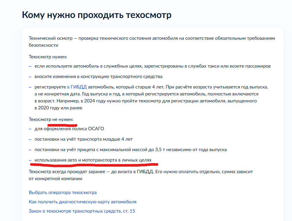 >7. Легковые автомобили и мототранспортные средства, принадлежащие на праве собственности физическим лицам и используемые ими исключительно в личных целях, не связанных с иной деятельностью, в том числе с предоставлением услуг по перевозке пассажиров и багажа легковым такси, осуществлением перевозок пассажиров, использованием личного транспорта в служебных целях, не подлежат техническому осмотру
