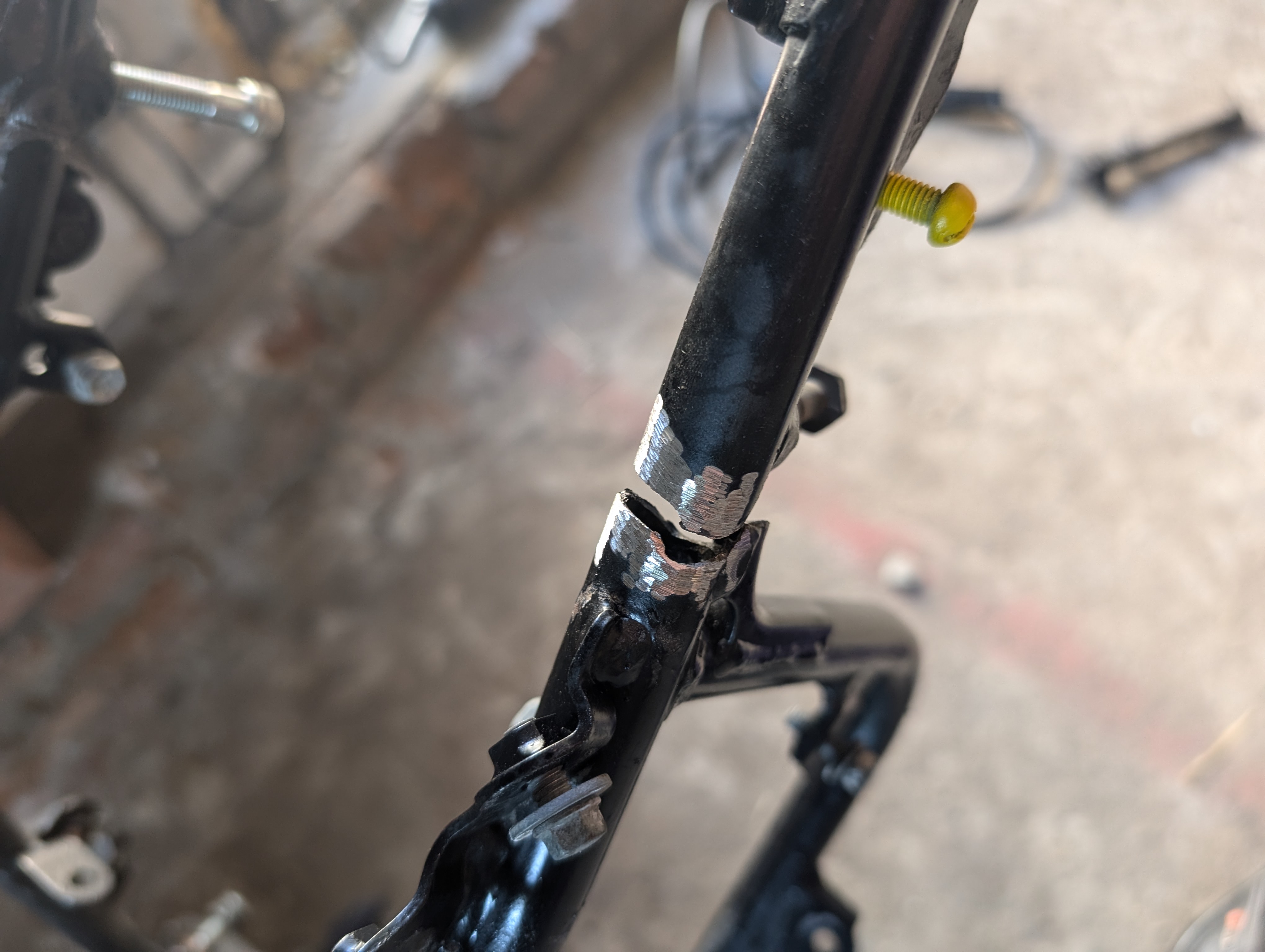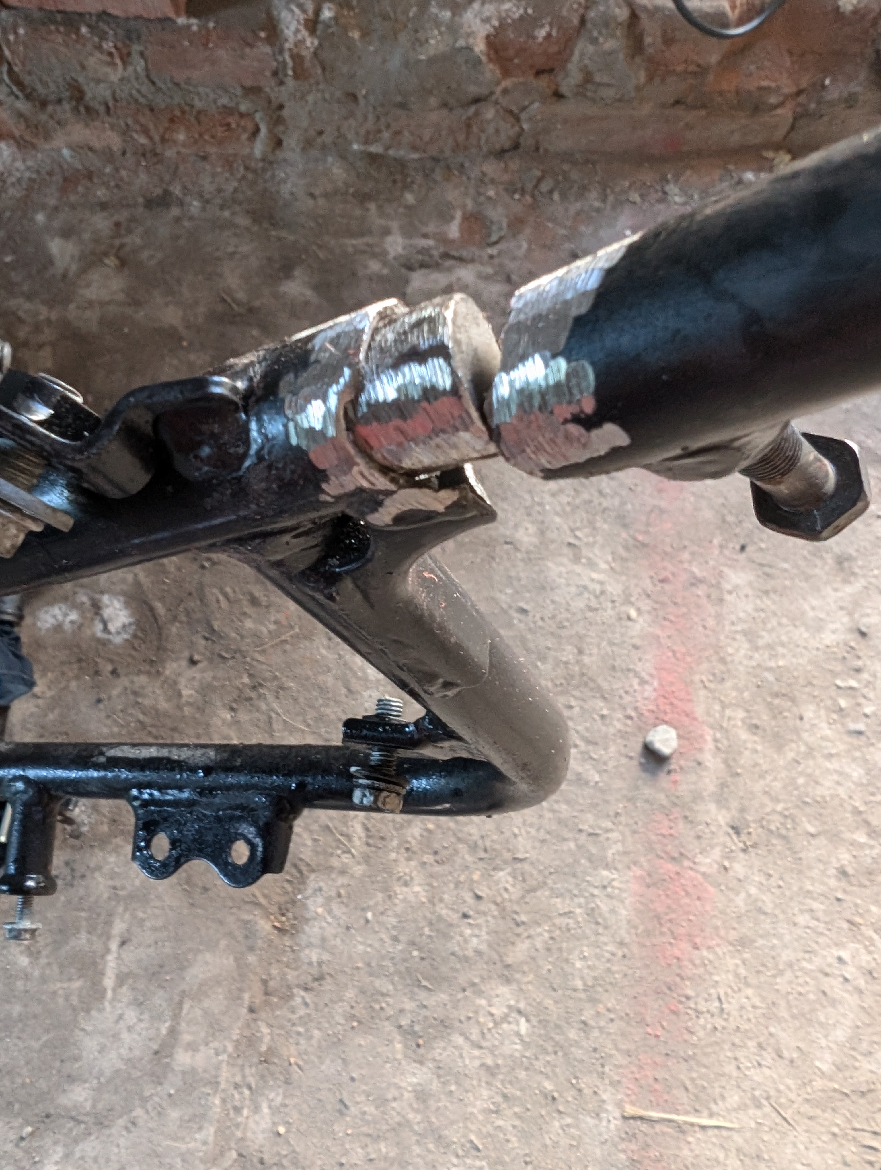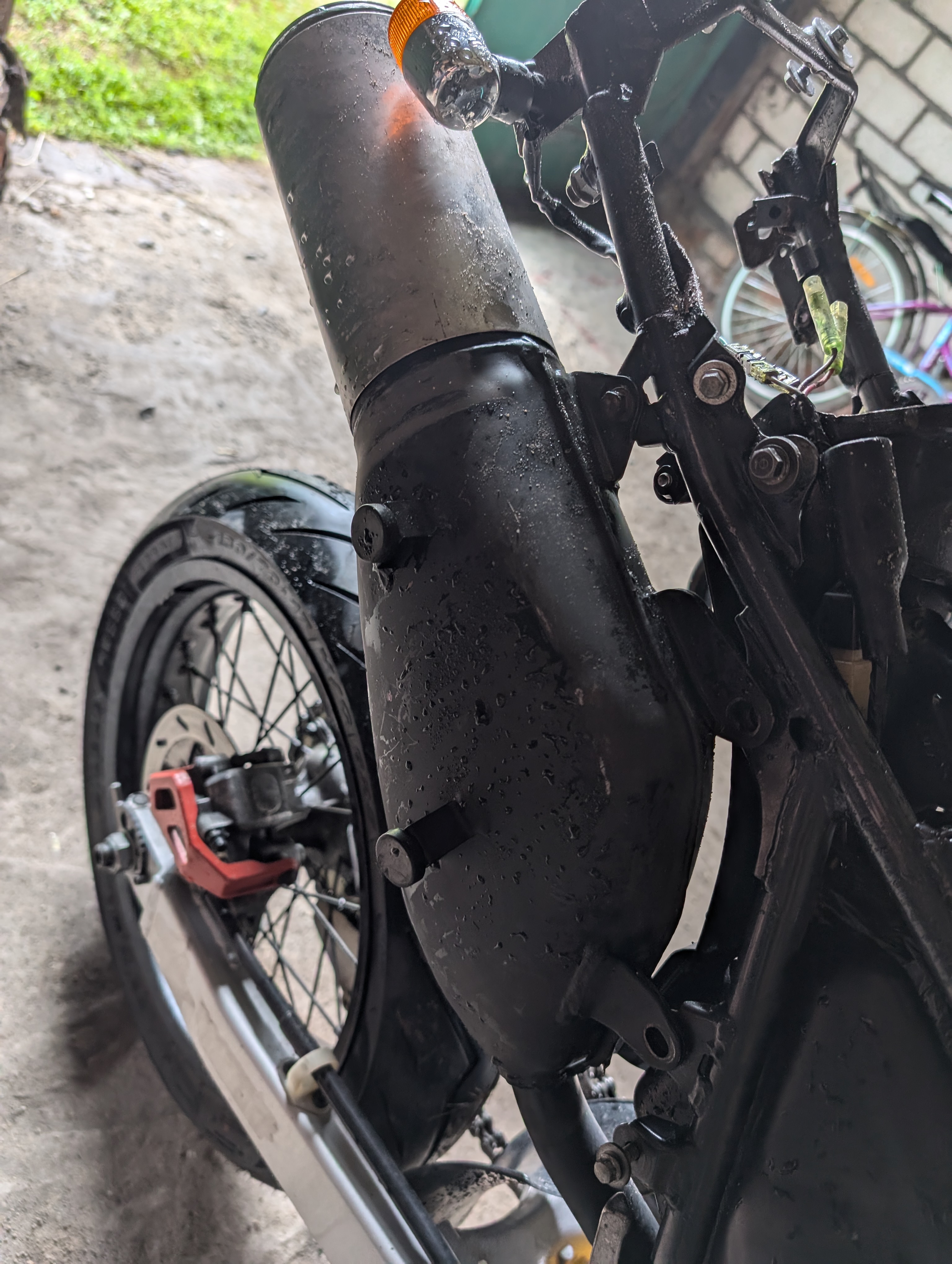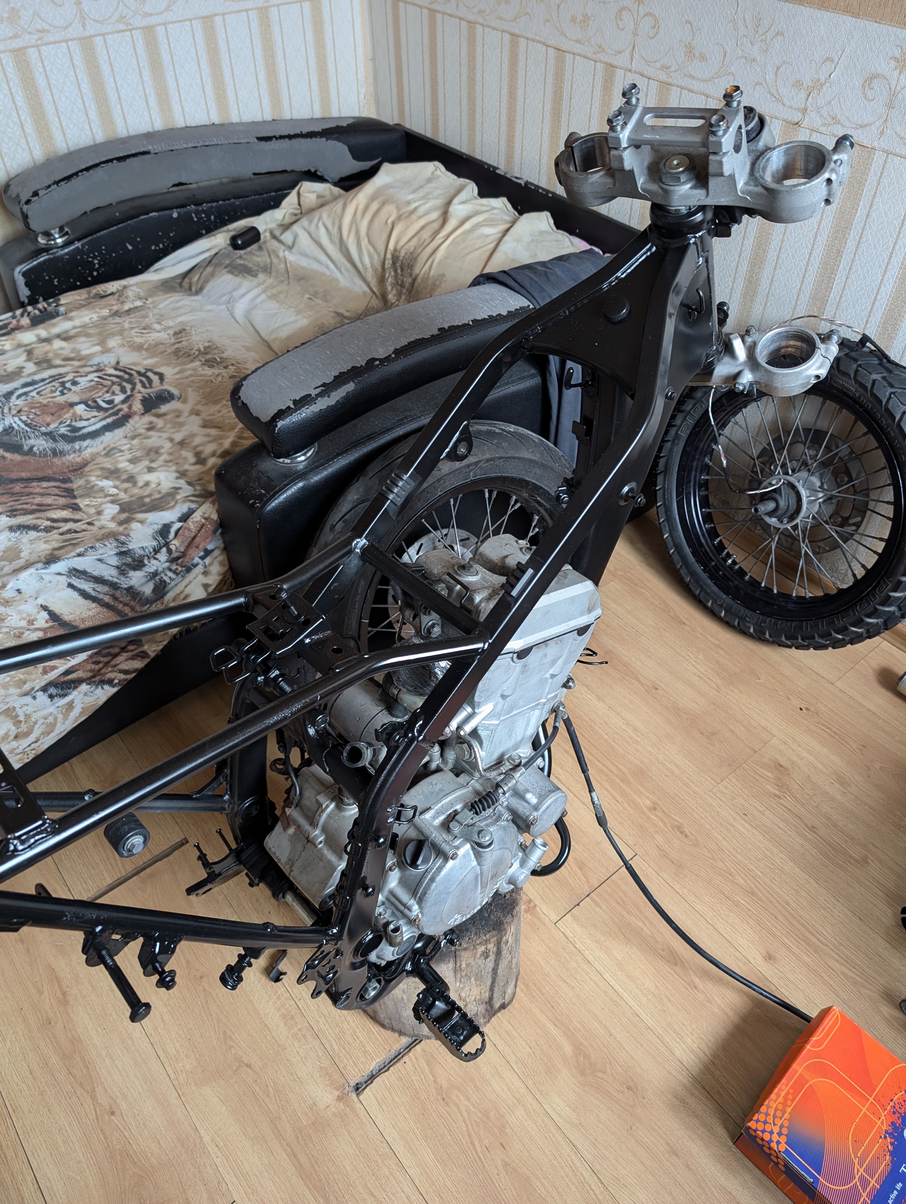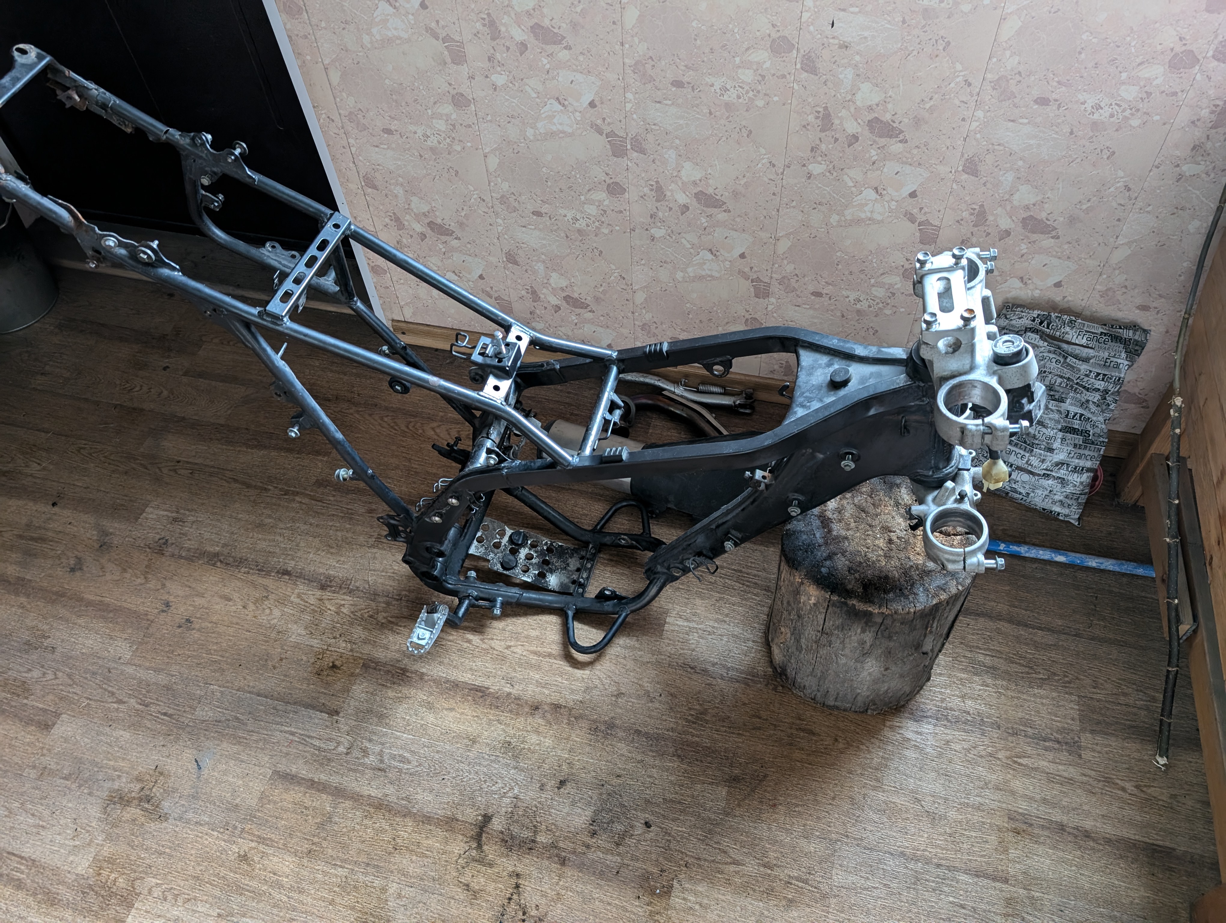 Заварил хвост потом помыл раму растворителем и обработал раст ремувером. Потом опять мытьё и теперь стоит в сарае обсыхает перед грунтовкой. На хвосте в месте где он был оторван решил метал бар вставить кусочек сантиметров три, на другой стороне где было треснуто, то просто проварил. Не очень красиво и не ватерпрув получилос, особенно со стороны где оторавано было, но вроде крепко. Время покажет, отвалится ли оно от вибраций или нет. Раст ремувер вроде рабочий, ржавчину поел, теперь на этих ржавых кусочках серо коричневый металл, причем плюс минус такой же цвет и там же, где металл был зачищен. Видимо оно не только со ржавчиной, но и с металлом в реакцию вступает. Но и пофиг, высохнет когда, то загрунтую ржавые участки, потом покрашу и когда совсем высохнет, то можно будет начать собирать по немножко с динамометрическим ключом.