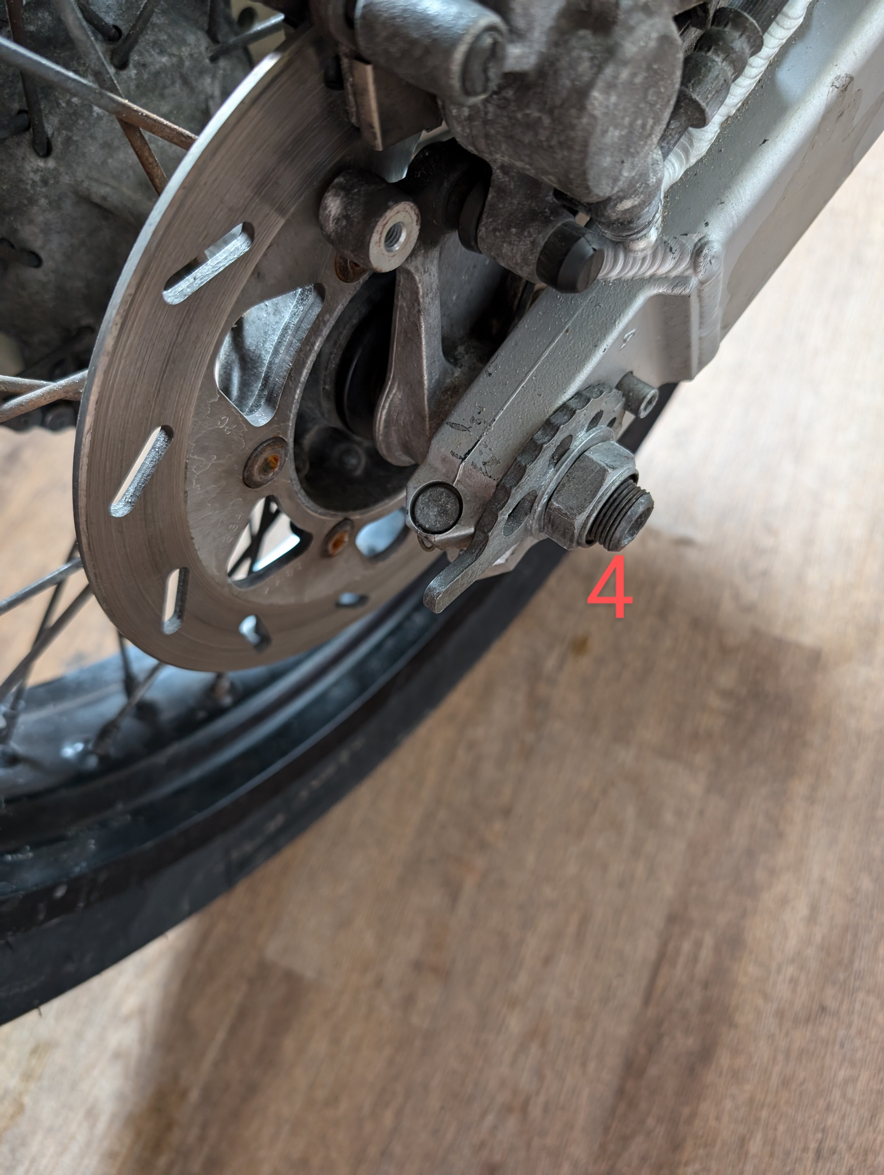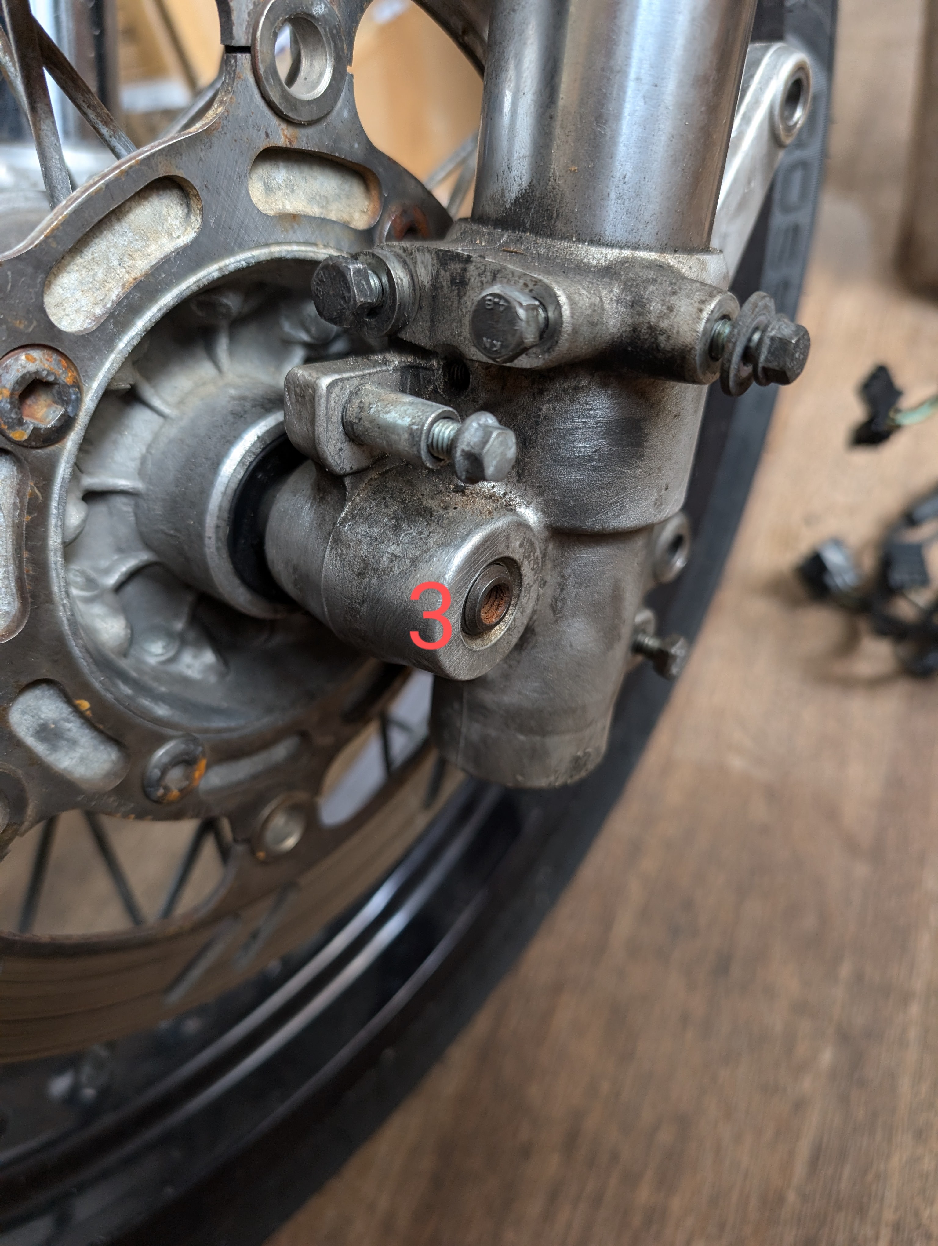 >>475270 >Я правильно пынямаю что для переднего нужно ослабить крышечку 1 и потом выкручивать ось 2 чтобы она вылезла из резьбы 3. Да, на моем KL250 так.