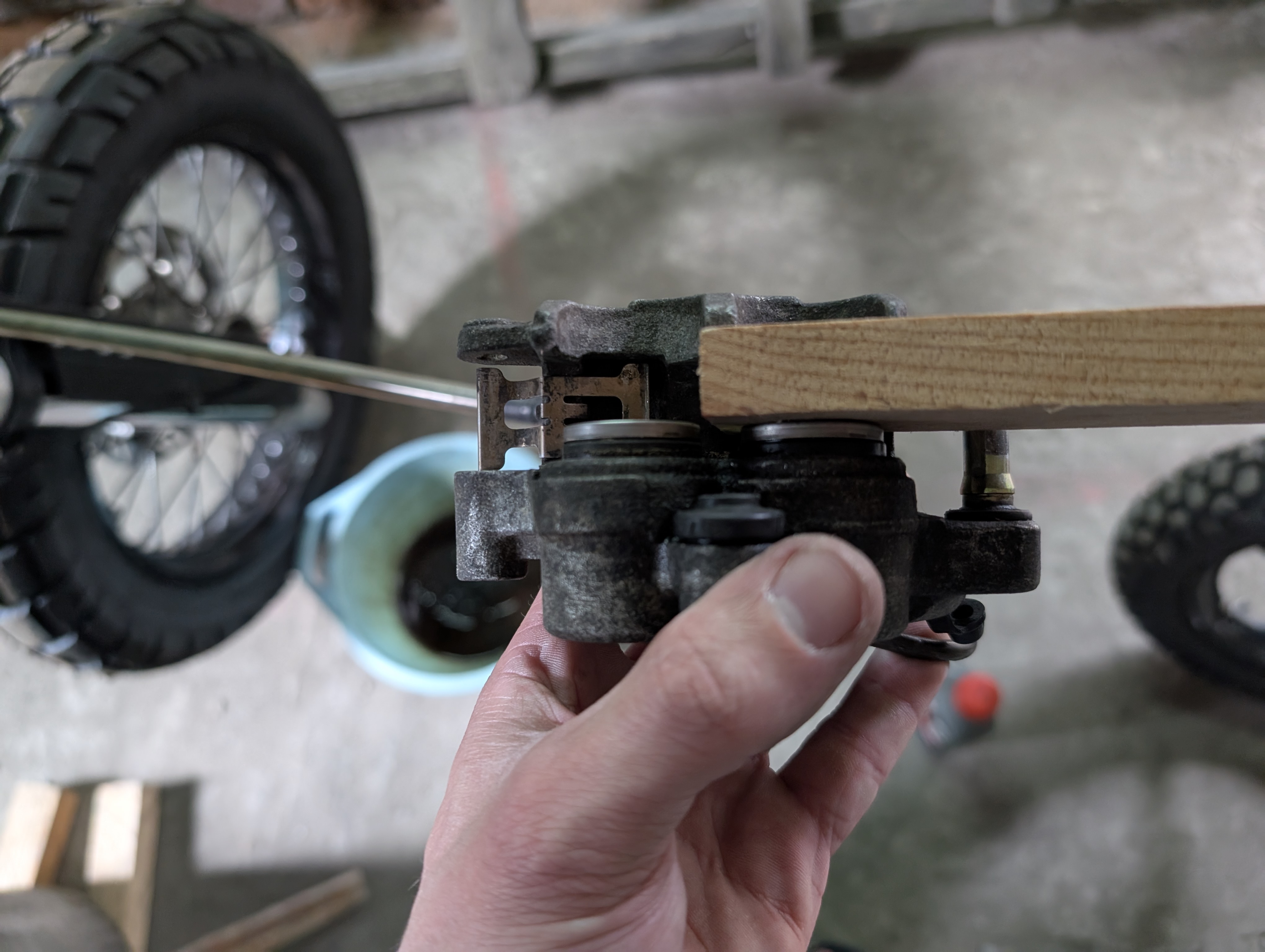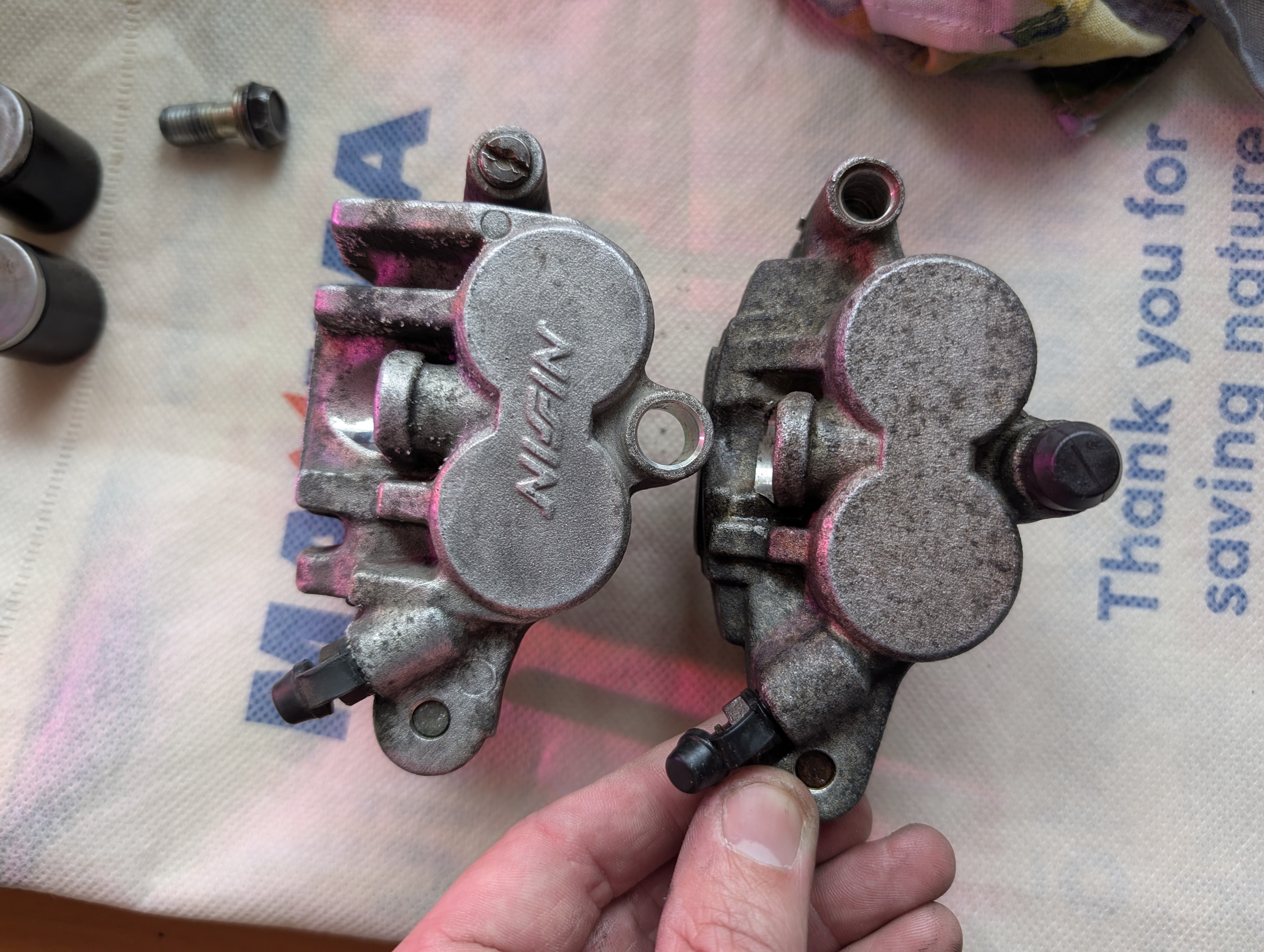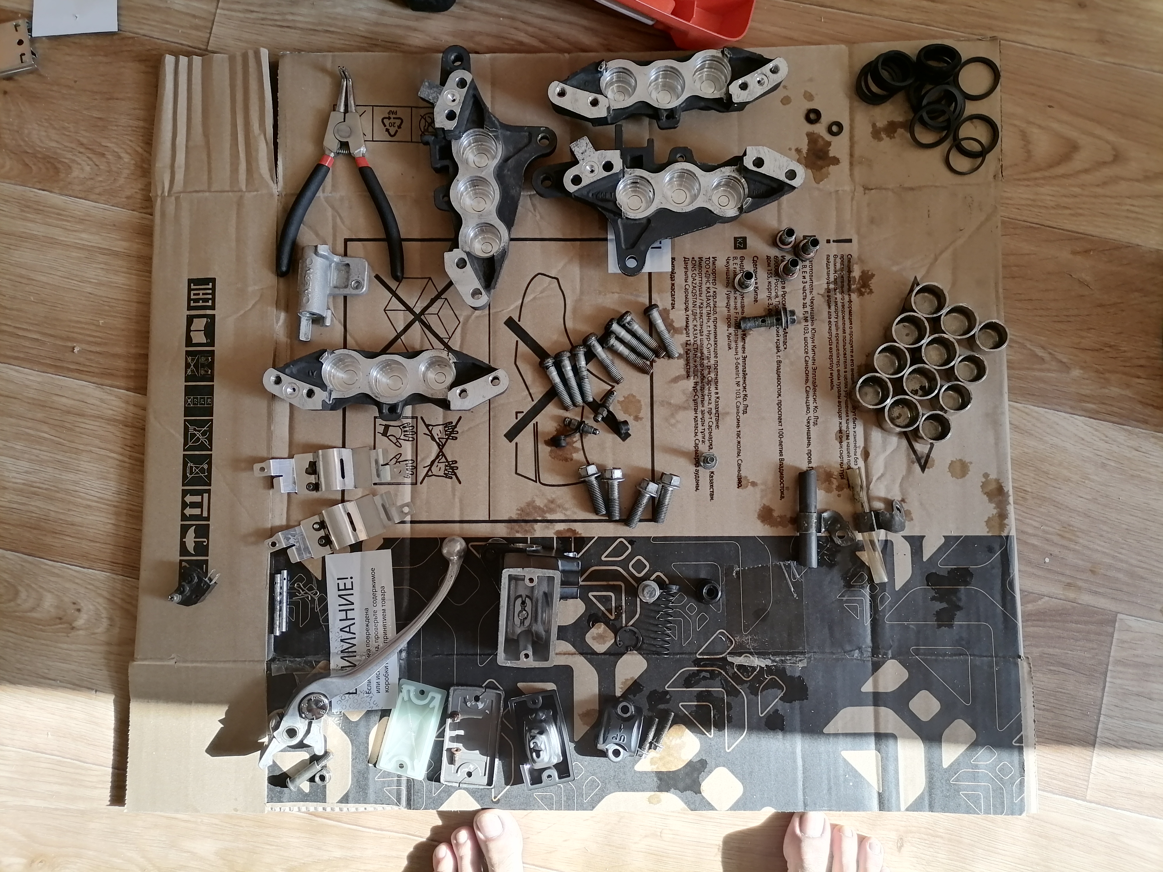 Бжиксер репортинг в тредю. Я вернулся к мопеду и в этот раз таки вытащил поршни удачно из нового старого суппорта с разбора. Метод стяжек правда, который мне посоветовали итт, у меня почему-то не сработал но вместо него я использовал метод дощечек, используя 3 разной толщины для каждой из стадий движения поршней, т.к. один из не хотел двигаться совместно с другим до самого почти конца.
