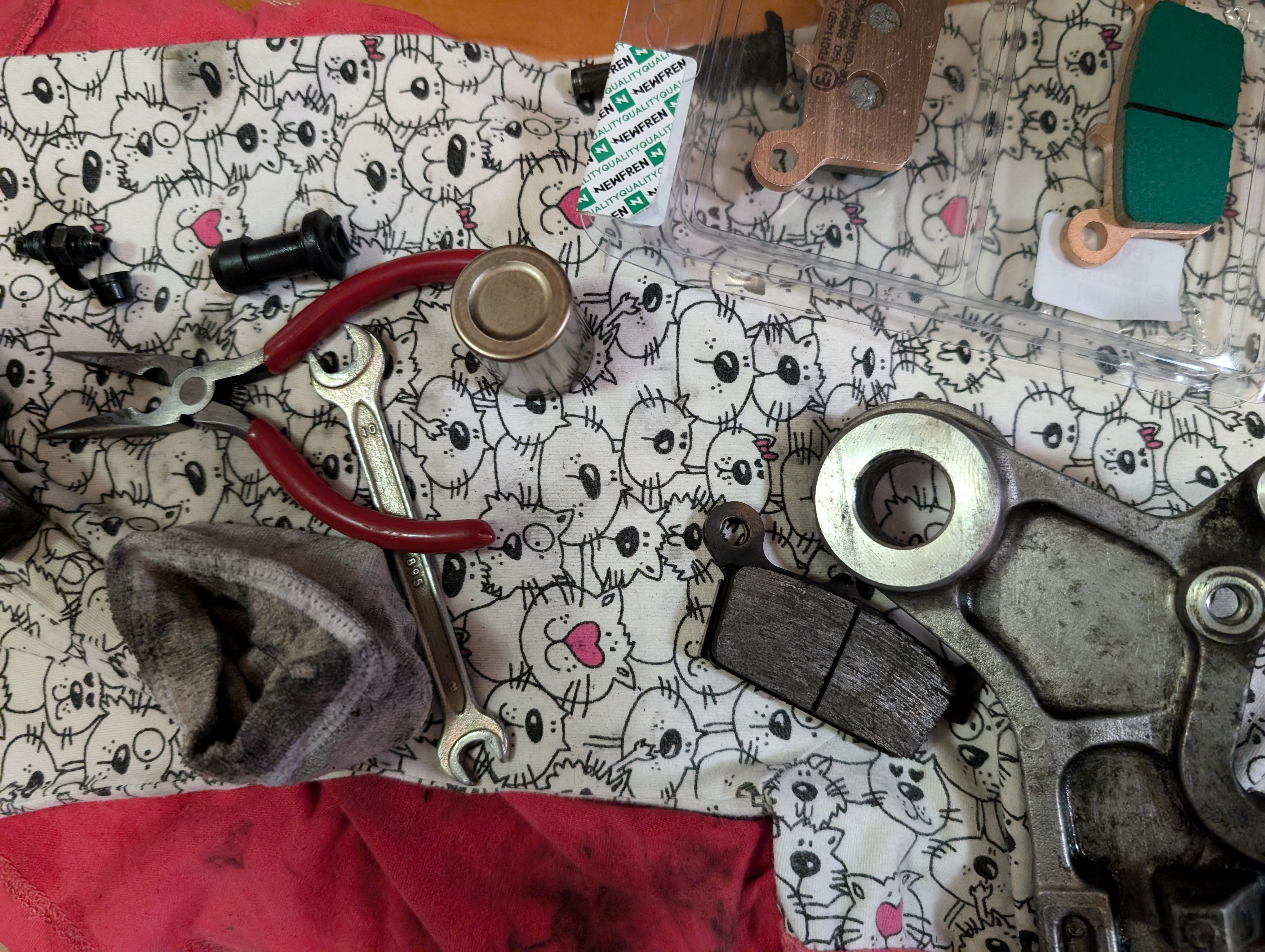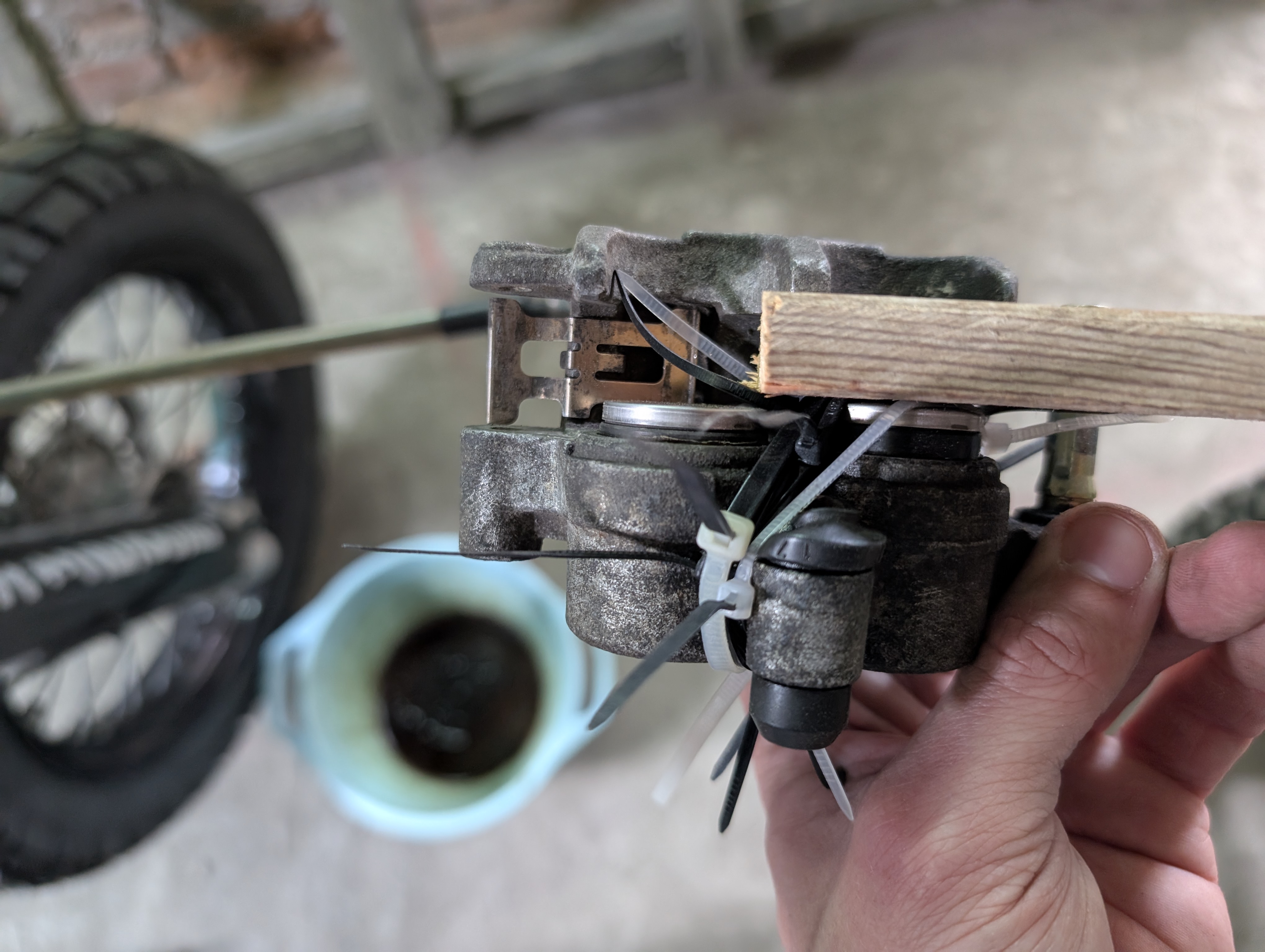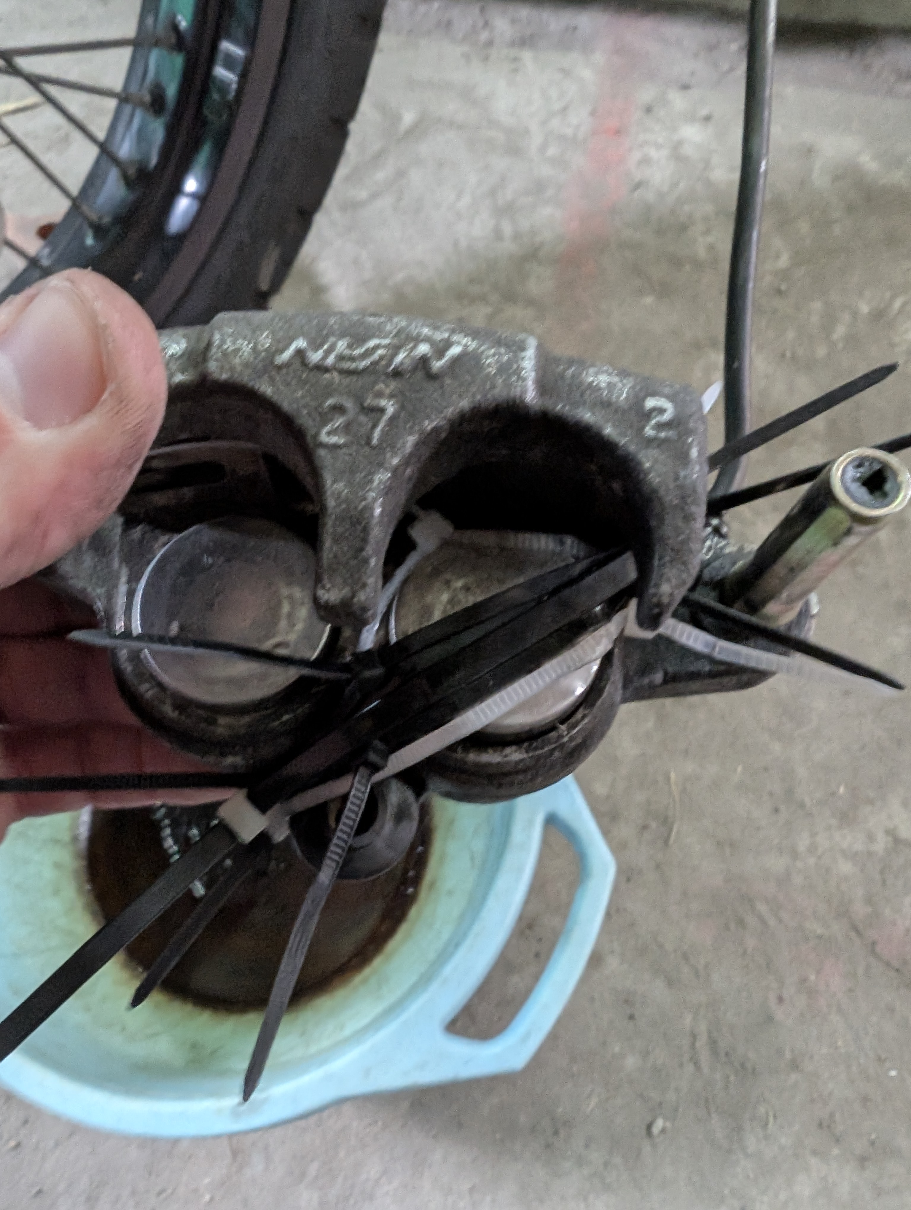 Бжиксер репортинг в тредю. Я вернулся к мопеду и в этот раз таки вытащил поршни удачно из нового старого суппорта с разбора. Метод стяжек правда, который мне посоветовали итт, у меня почему-то не сработал но вместо него я использовал метод дощечек, используя 3 разной толщины для каждой из стадий движения поршней, т.к. один из не хотел двигаться совместно с другим до самого почти конца.