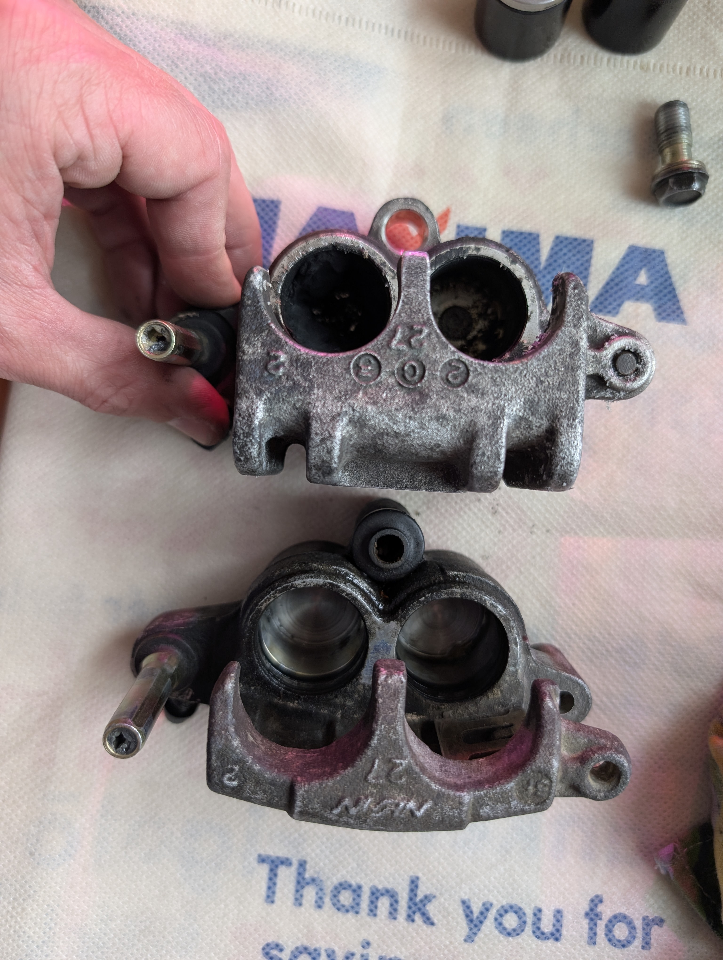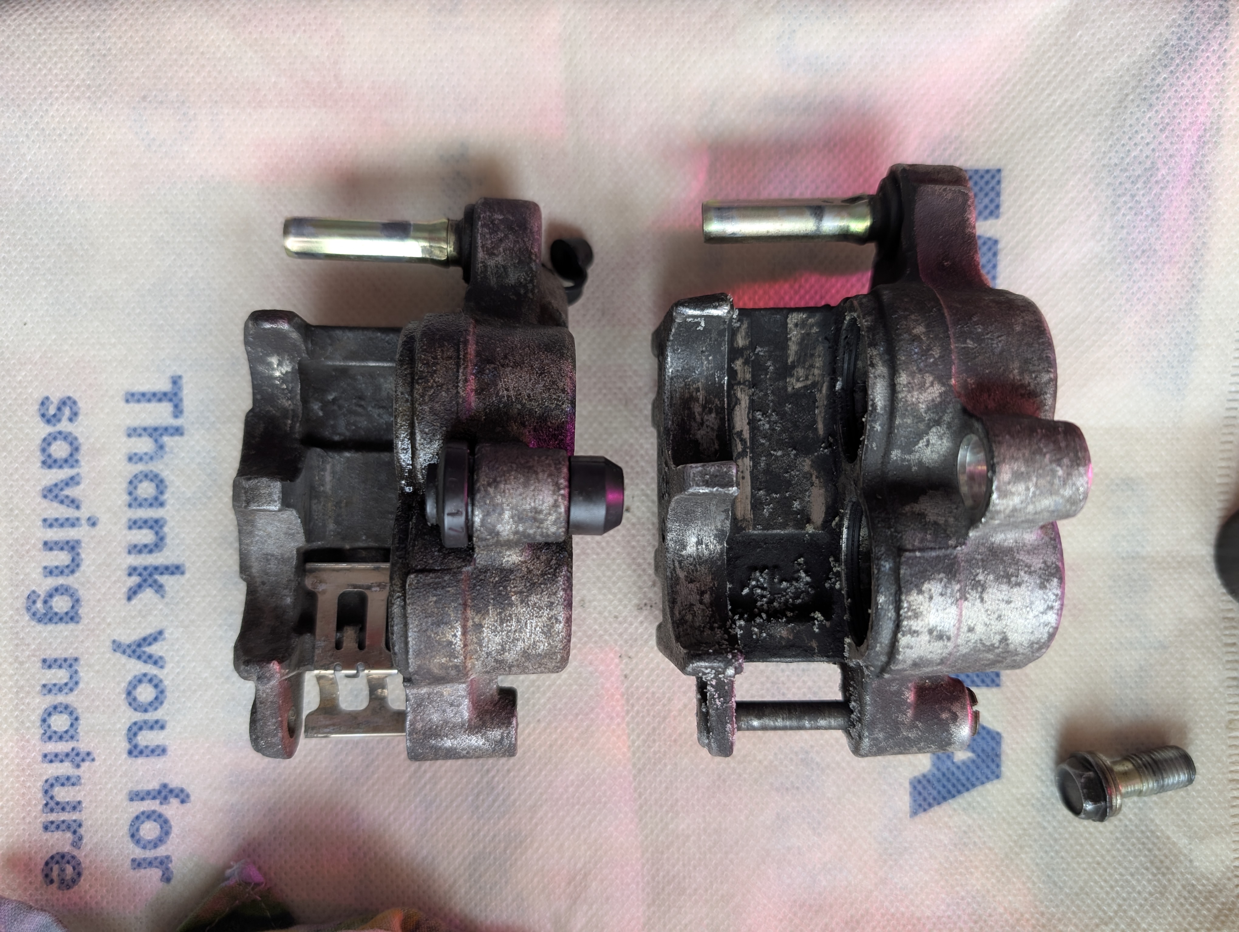 Ну и собственно вот что интересно - вот эти тормозные калиперы очень похожи и буквально одинаковые во всём кроме отличий в форме корпуса. Но несмотря на похожесть они всё таки разные. Я хочу поставить тот калипер, который мне прислали, т.к. в старом всё ещё разрушенный поршень и никак его не извлечь плюс я ещё сам цилиндр покоцал. Собственно выбора какой ставить у меня нет, но интересно какие подводные камни в этом всём?