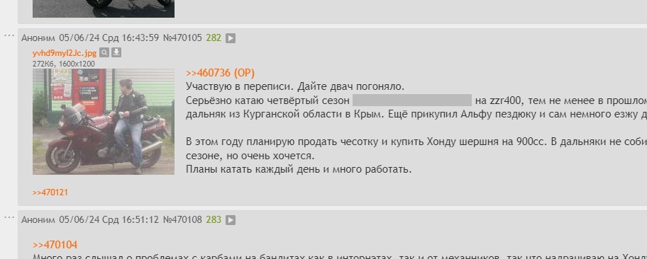 Булкан-цыган на связи. Еще даже не выезжал, в этом году пиздец с погодой, в конце апреля снега за день навалило больше, чем в любой зимний день. Даже не было нормального свободного вечера, чтобы сгонять к корешу масло в моте поменять. В планах просто катать, может небольшие минидальняки по области. Главное не разложиться сослепу - нихуя не вижу в последнее время. Хотел подобрать новые очки - авотхуй, не подобрать, катаракта на обоих глазах, нужно делать операцию по замене хрусталиков. Отака хуйня, малята.