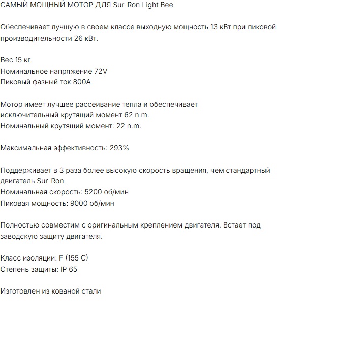 Это +- ррц суррона. На плохой вилке, обычной барарейке, не шитый, всё равно по ттх, скорости и весу ебнёт альфу. Да и любой эндурик до 450сс. И его не надо обслуживать в привычном понимаении, говняться маслом, бесконечно чинить. Просто не перегревай мотор, следи за батарейкой и не топи. Свои 30-50к проедет.