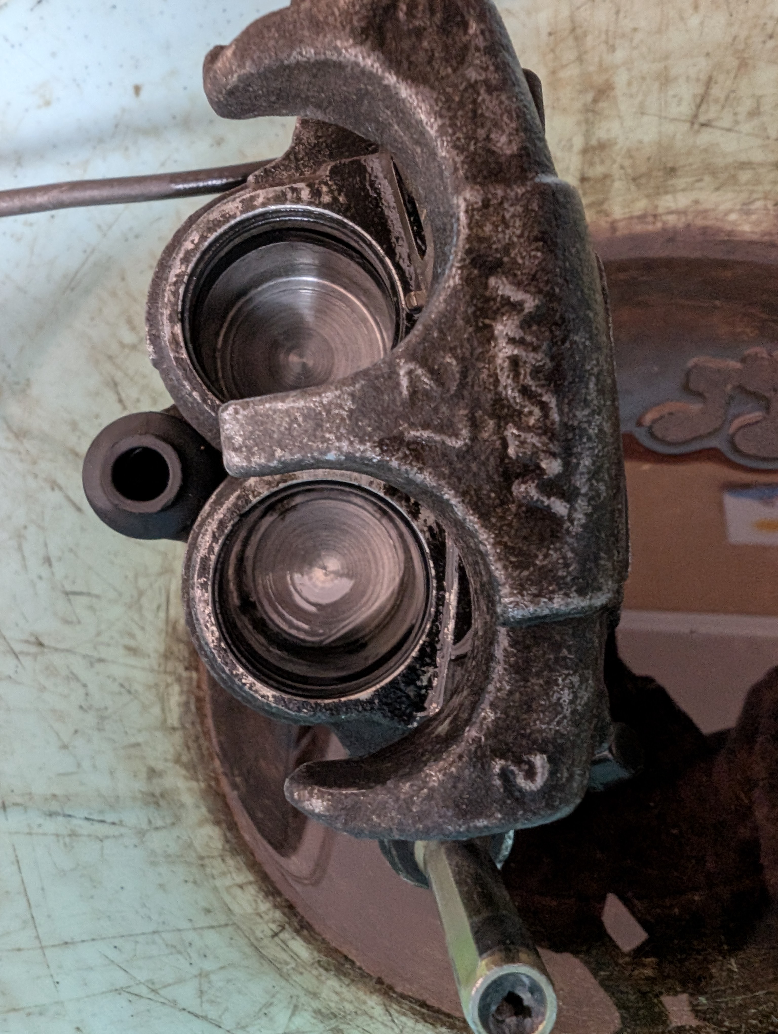 Собственно что - после пары часов манипуляций с перестановкой поршней и сальников туда сюда я всё таки достиг определеного успеха. Пусть один из поршней пальцами не вдавливается на фулл, но хотя бы он вроде как не блокирует дощечку. Но будет ли это работать с колодками это вопрос, т.к. для того, чтобы колодки новые поставить нужно полное утопление поршней и не факт, что из того положения он будет работать как надо. Алсо, сейчас система не идеально прокаченная и там ещё есть воздух. В принципе можно рискнуть и попробовать установить