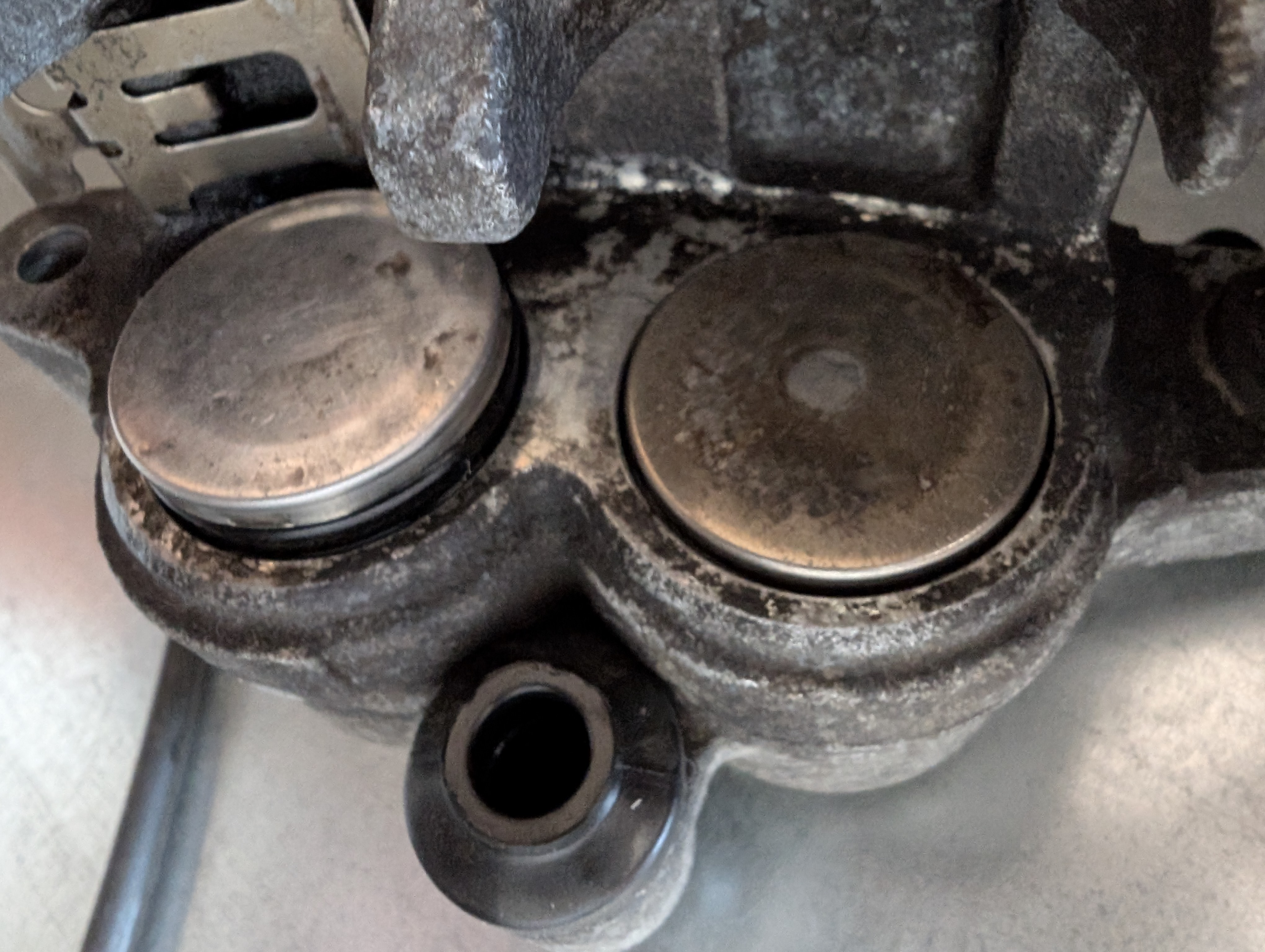 Чо за хуйня? Почему один поршень работает нормально, а второй который ближе к выпускному штуцеру залипает и с полным калипером не вдавливается туда пальцами до конца а торчит? Внутри визуально более менее гладко всё, только на дне какой-то микро говняк.